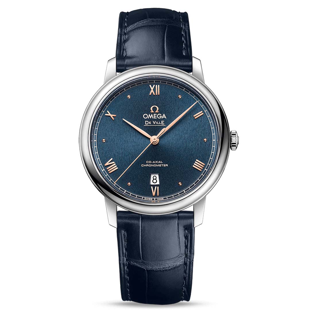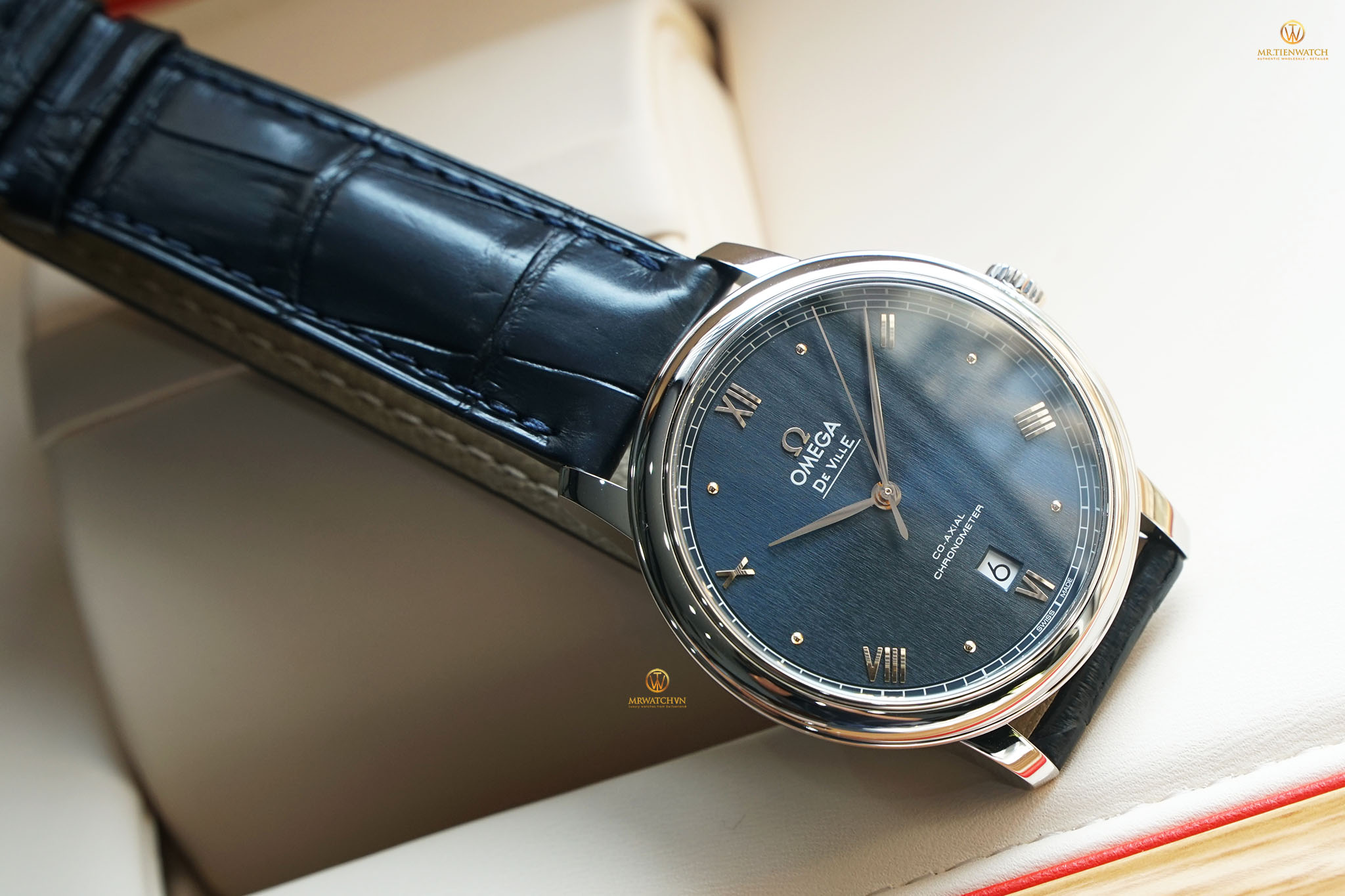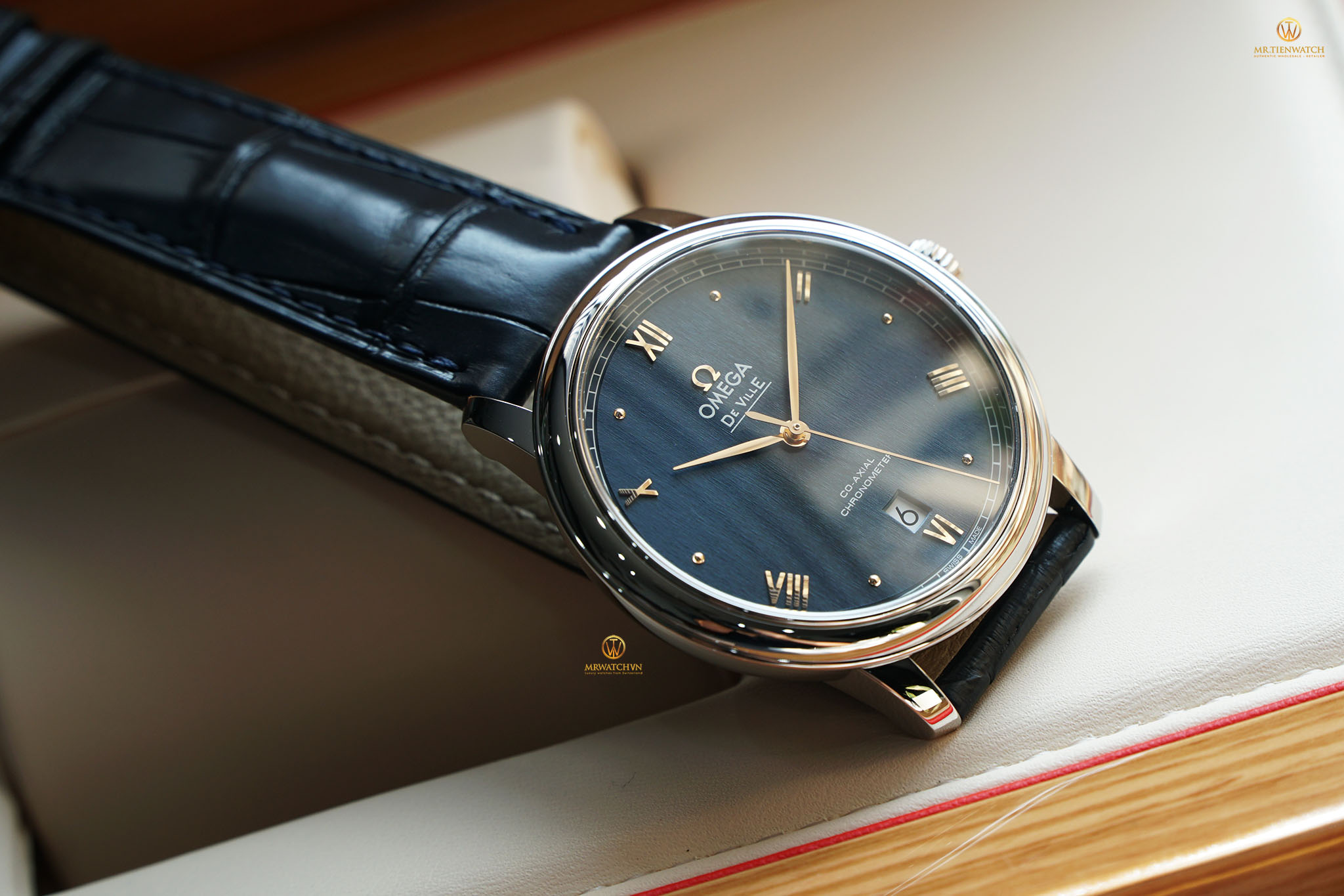 OMEGA DE-VILLE PRESTIGE CO‑AXIAL CHRONOMETER 39,5 MM 424.13.40.20.03.004 (42413402003004) thuộc bộ sưu tập OMEGA De Ville Prestige, với thiết kế thanh lịch, cổ điển luôn thu hút một lượng lớn những tín đồ yêu thích đồng hồ. Những mẫu đồng hồ De Ville Prestige đặc trưng bởi kiểu dáng tinh tế, sang trọng cùng thiết kế vượt thời gian. Mẫu đồng hồ OMEGA 424.13.40.20.03.004 có mặt số xanh được tạo hiệu ứng tỏa sáng xoắn ốc, với các vạch chỉ giờ chữ số La Mã bằng vàng đỏ red gold 18K. Mặt số được bảo vệ bởi lớp kính sapphire chống trầy xước với cửa sổ ngày ở vị trí 6 giờ. Vỏ được làm bằng thép không gỉ có đường kính 39,5 mm, kết hợp hoàn hảo cùng dây đeo bằng da cao cấp. Trái tim trung tâm cung cấp năng lượng cho mẫu đồng hồ này là bộ chuyển động Calibre 2500 Co-Axial.