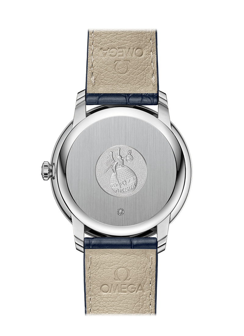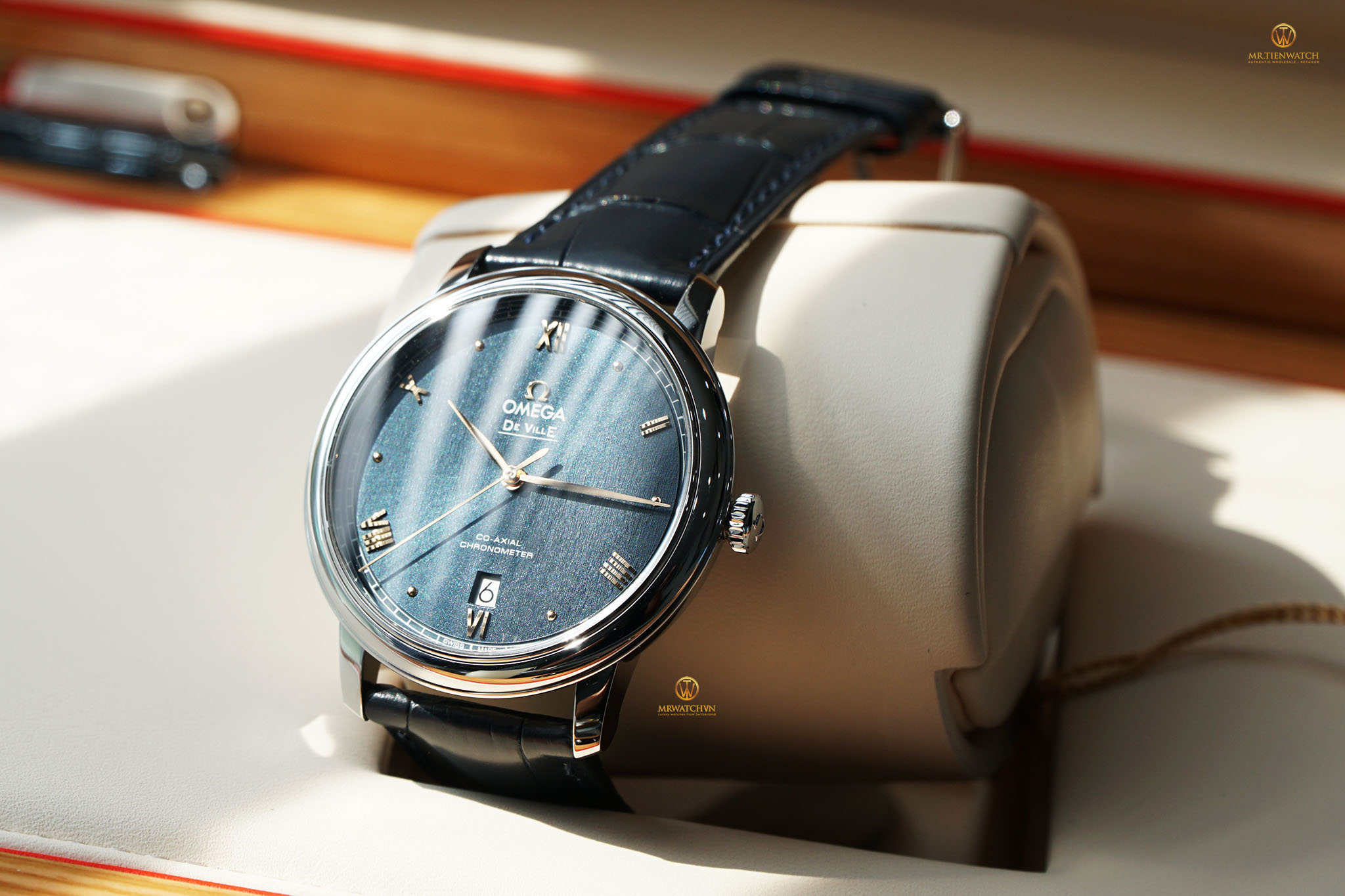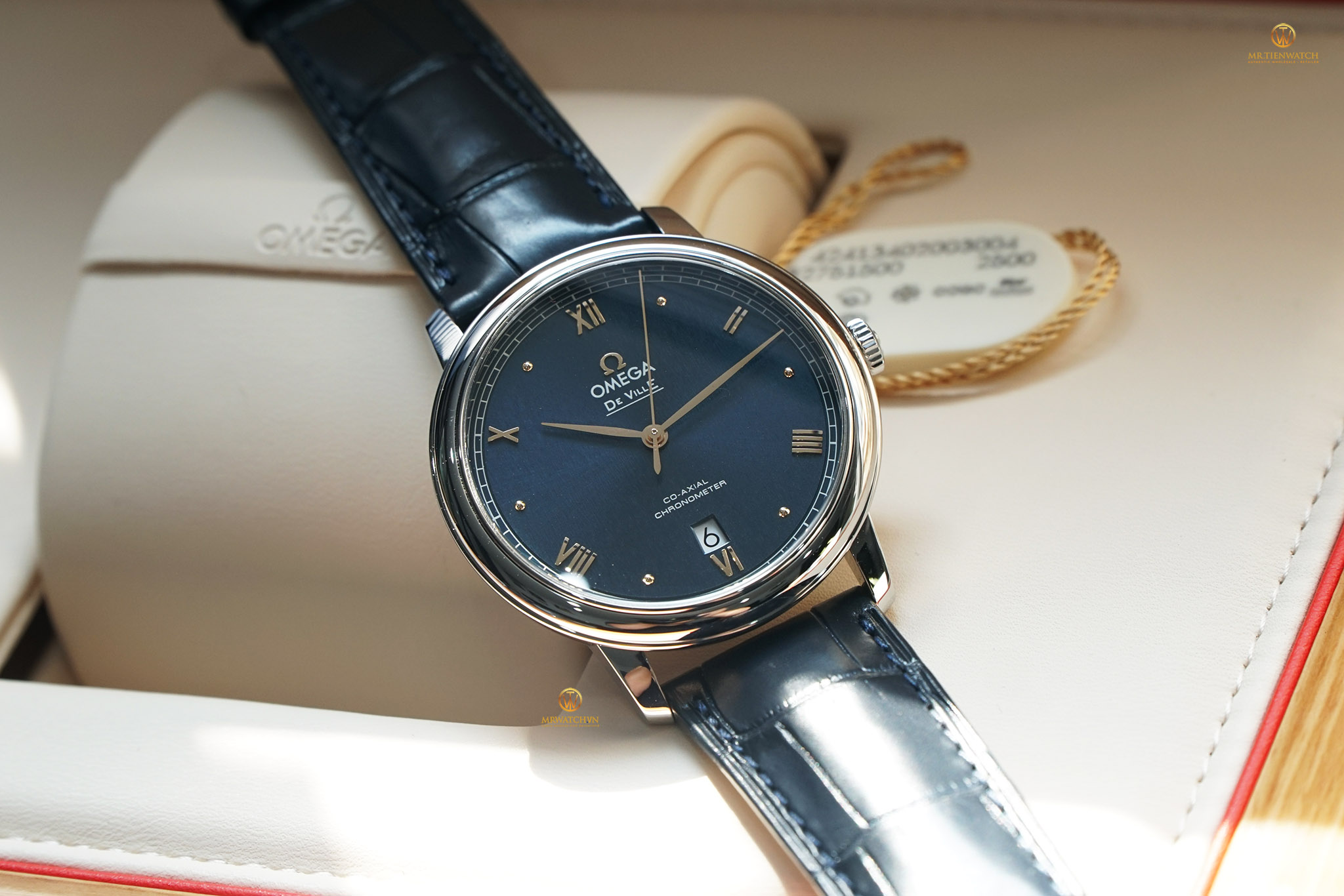 OMEGA DE-VILLE PRESTIGE CO‑AXIAL CHRONOMETER 39,5 MM 424.13.40.20.03.004 (42413402003004) thuộc bộ sưu tập OMEGA De Ville Prestige, với thiết kế thanh lịch, cổ điển luôn thu hút một lượng lớn những tín đồ yêu thích đồng hồ. Những mẫu đồng hồ De Ville Prestige đặc trưng bởi kiểu dáng tinh tế, sang trọng cùng thiết kế vượt thời gian. Mẫu đồng hồ OMEGA 424.13.40.20.03.004 có mặt số xanh được tạo hiệu ứng tỏa sáng xoắn ốc, với các vạch chỉ giờ chữ số La Mã bằng vàng đỏ red gold 18K. Mặt số được bảo vệ bởi lớp kính sapphire chống trầy xước với cửa sổ ngày ở vị trí 6 giờ. Vỏ được làm bằng thép không gỉ có đường kính 39,5 mm, kết hợp hoàn hảo cùng dây đeo bằng da cao cấp. Trái tim trung tâm cung cấp năng lượng cho mẫu đồng hồ này là bộ chuyển động Calibre 2500 Co-Axial.