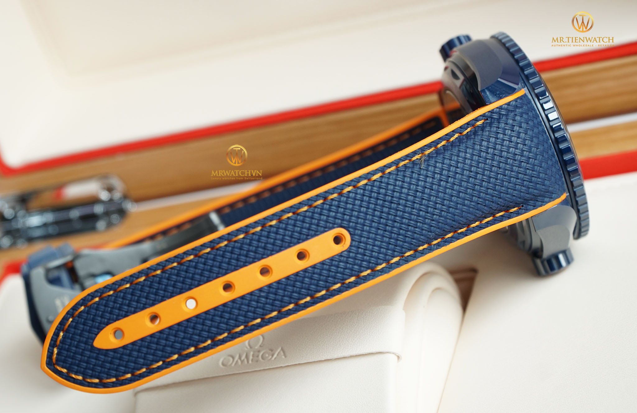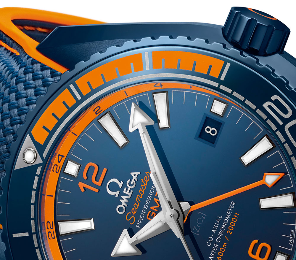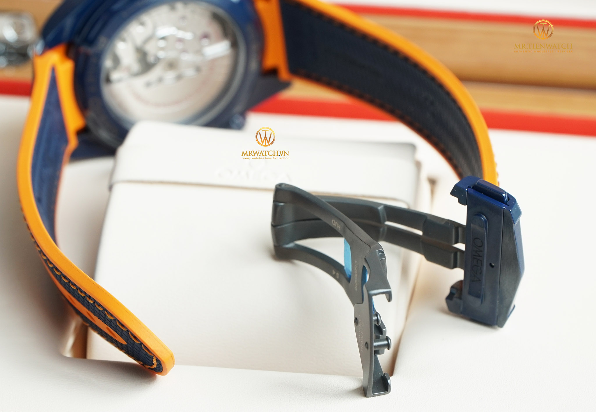 Viền gốm màu xanh lam có các vạch phút phủ kim loại lỏng và phần viền 15 phút đầu tiên được lấp đầy bằng cao su màu cam sáng cực kỳ bắt mắt. Ngoài ra còn có những điểm nhấn màu cam khác như : núm vặn gốm xanh được khắc logo Omega màu cam sáng, mặt số được bao quanh bởi vòng GMT màu cam và kim GMT cũng màu cam sáng.
