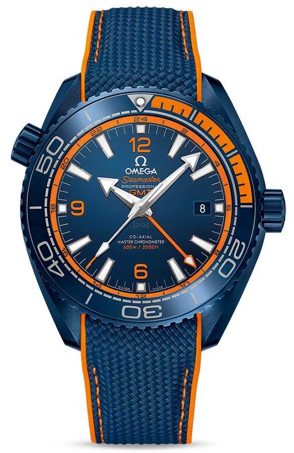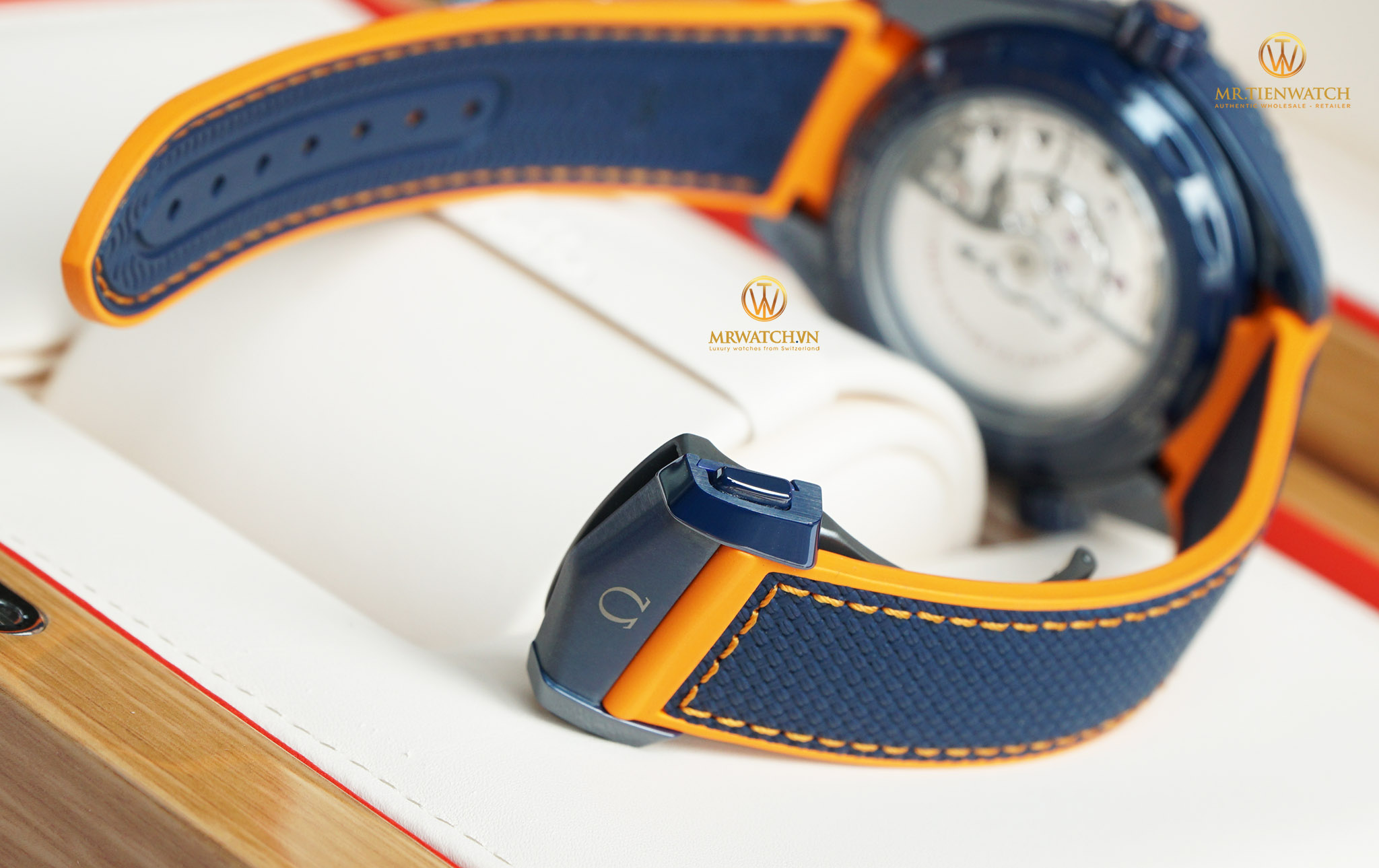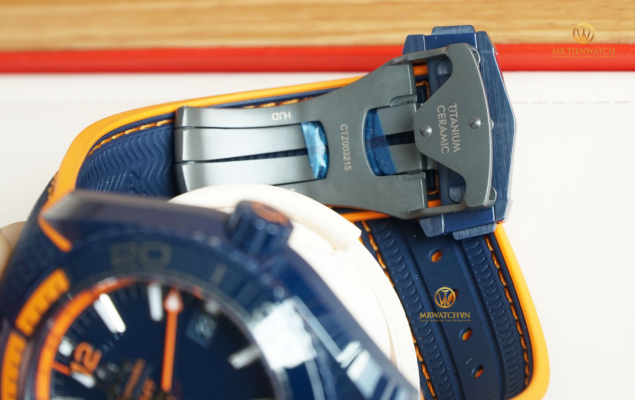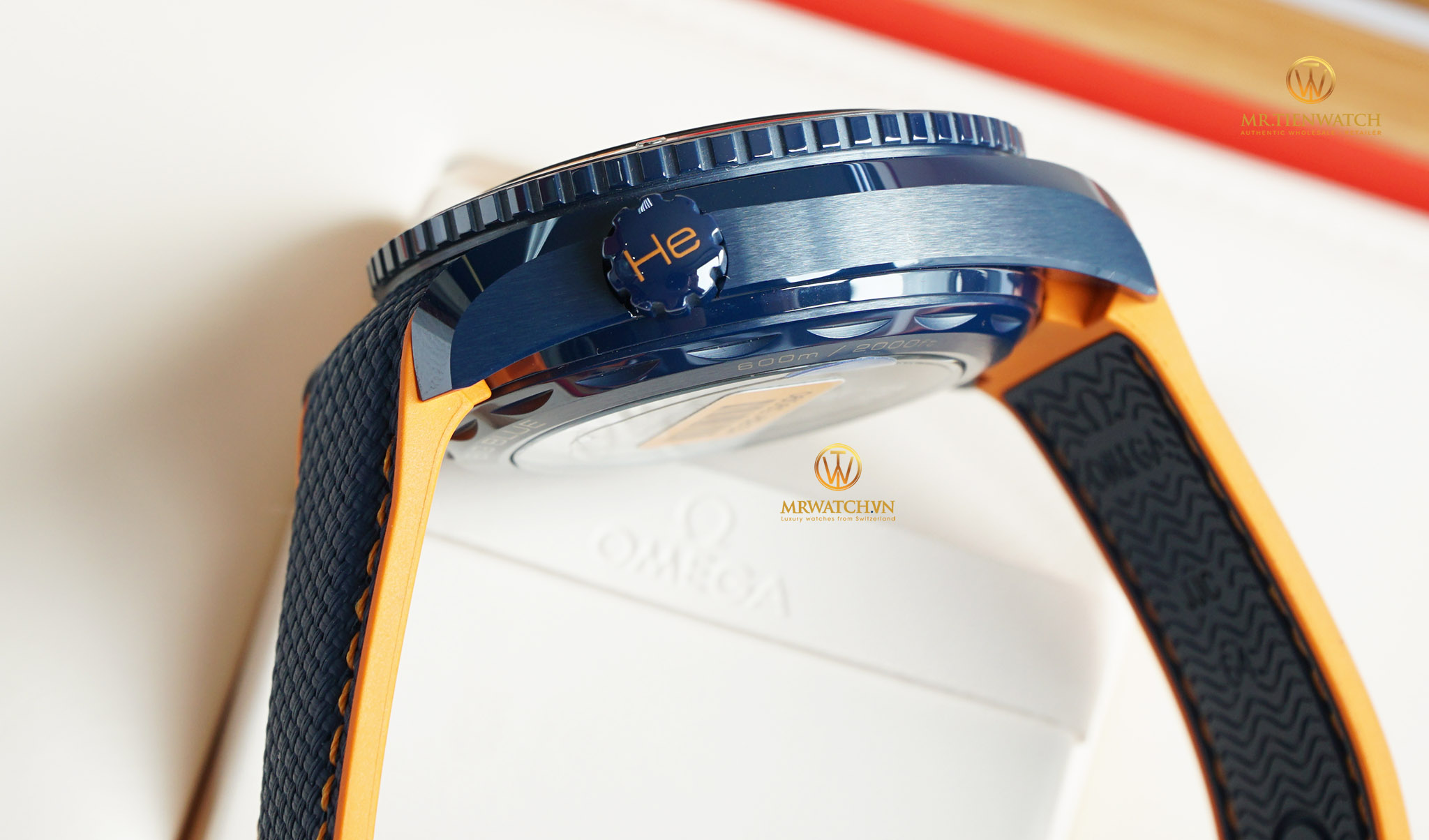 Viền gốm màu xanh lam có các vạch phút phủ kim loại lỏng và phần viền 15 phút đầu tiên được lấp đầy bằng cao su màu cam sáng cực kỳ bắt mắt. Ngoài ra còn có những điểm nhấn màu cam khác như : núm vặn gốm xanh được khắc logo Omega màu cam sáng, mặt số được bao quanh bởi vòng GMT màu cam và kim GMT cũng màu cam sáng.