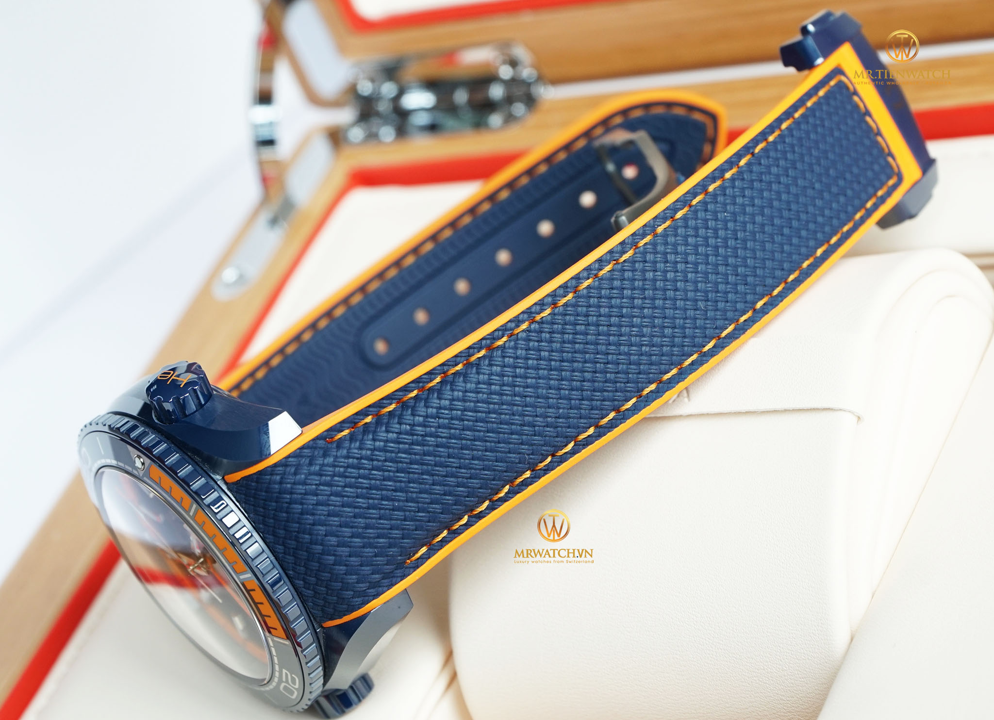 Tôi thực sự thích cách phối màu cam và xanh này, hai màu tương phản rực rỡ làm mẫu đồng hồ trông trẻ trung và nổi bật vô cùng. Cuối cùng, tất cả giờ, phút,giây và các chỉ số giờ, đều được làm từ vàng trắng 18K phủ SuperLuminova (siêu dạ quang).