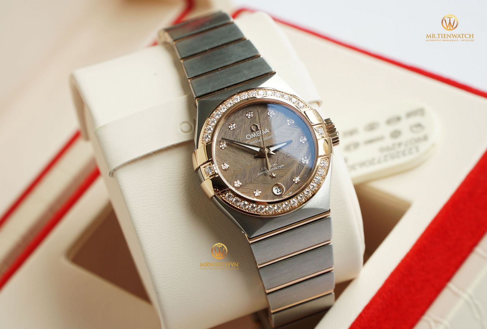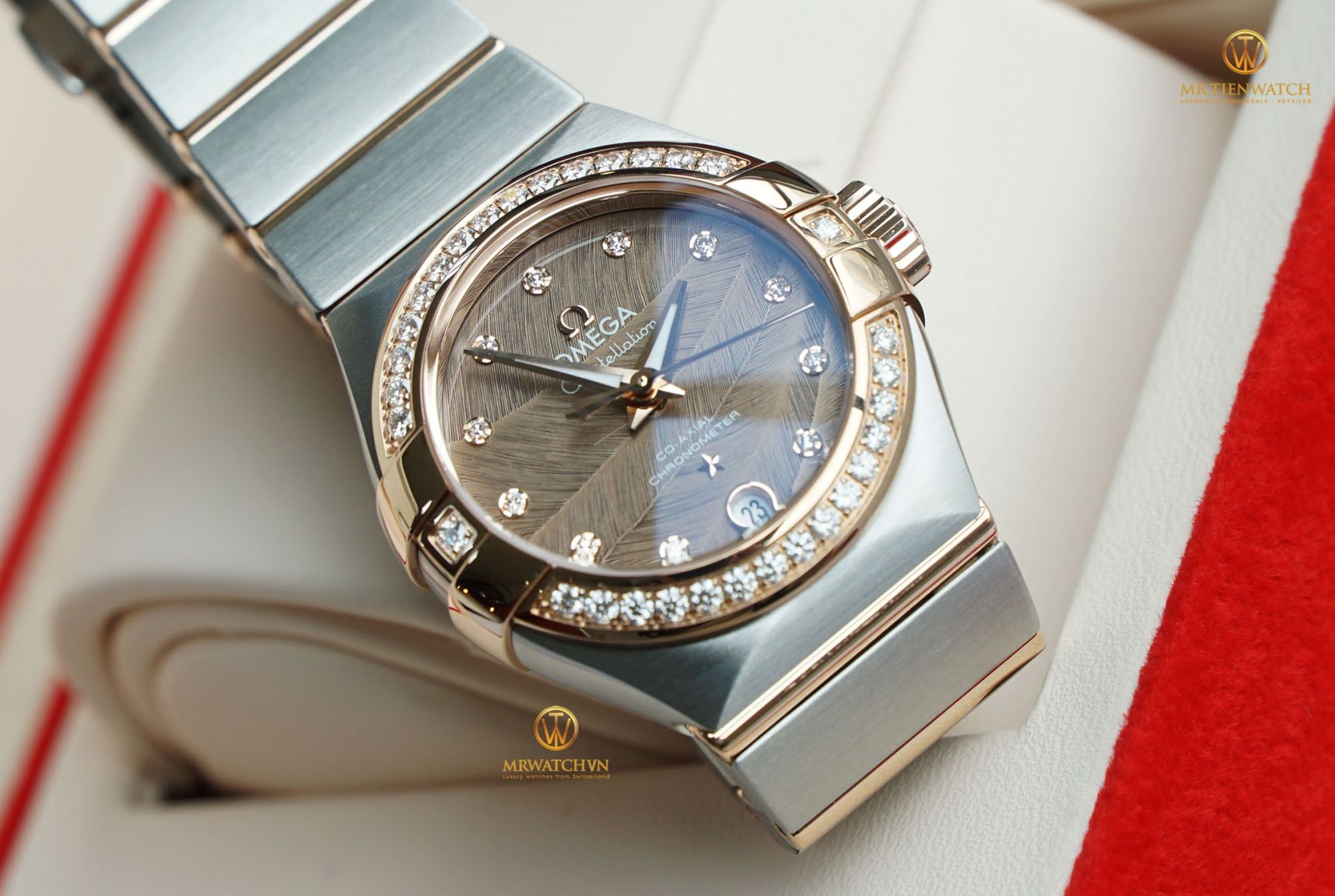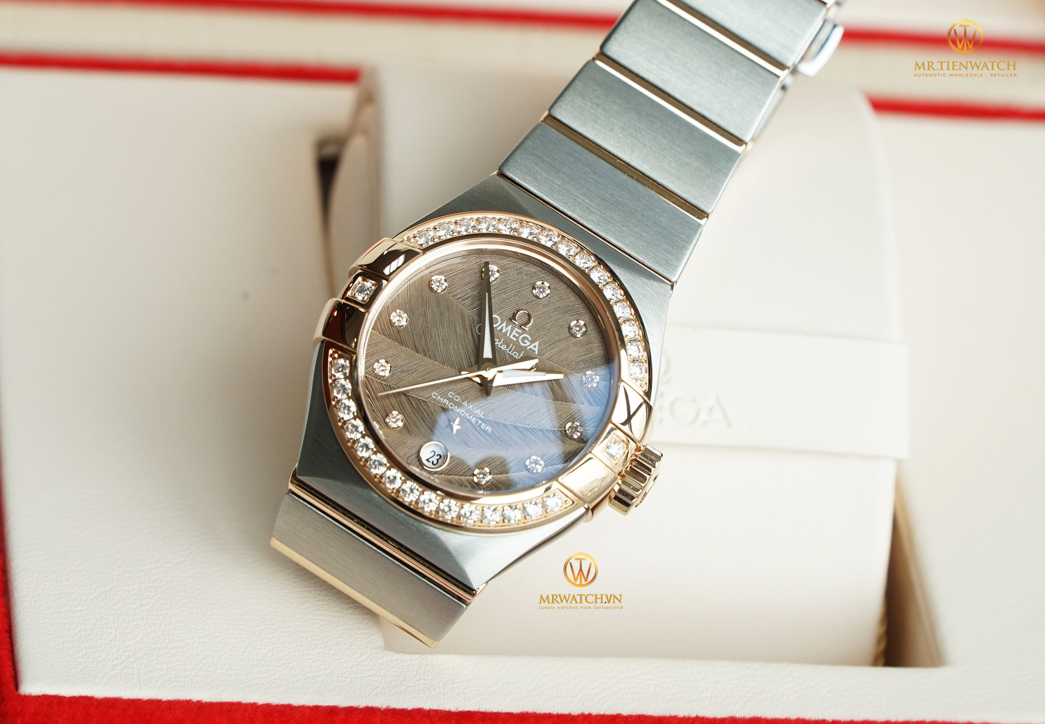 Phần lớn Khách hàng của chúng tôi là nam, tuy vậy vẫn có nhiều Order là dành cho nữ, và hôm nay trên tay chúng tôi là một trong những mẫu Omega đẹp và ấn tượng nhất dành cho " Lady". Phiên bản OMEGA CONSTELLATION CO‑AXIAL 27 MM 123.25.27.20.63.001 mặt số lông vũ rất hiếm và tuyệt đẹp..