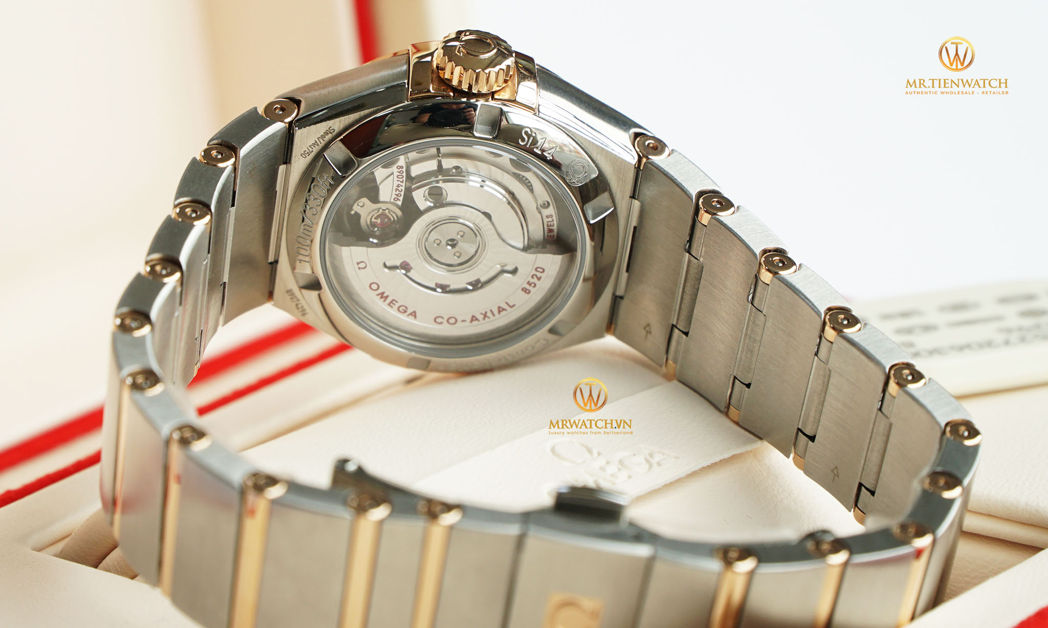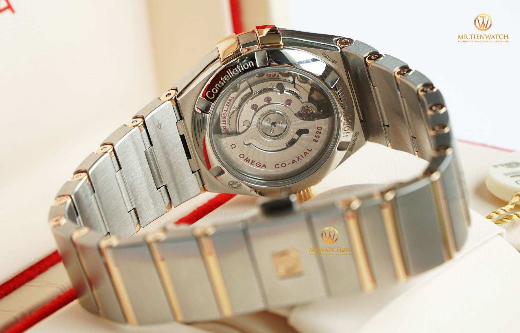 Ở mặt sau vỏ, qua ốp lưng bằng kính saphire trong suốt, có thể thấy toàn bộ chuyển động của calibre 8250 Omega Co-Axial. Bộ chuyển động tự động đạt chứng chỉ Chronometer siêu chính xác (Certified Chronometer, approved by METAS) sai số cho phép không quá +-3s/ngày, có mức dự trữ năng lượng lên tới 50 giờ cùng khả năng chống nước 100 mét. Giống như hầu hết các mẫu đồng hồ trong bộ sưu tập, mẫu Omega Constellation Co-Axial 27mm đặc biệt này được nạm kim cương, với 32 viên kim cương tự nhiên 0,55ct được đính trên viền.