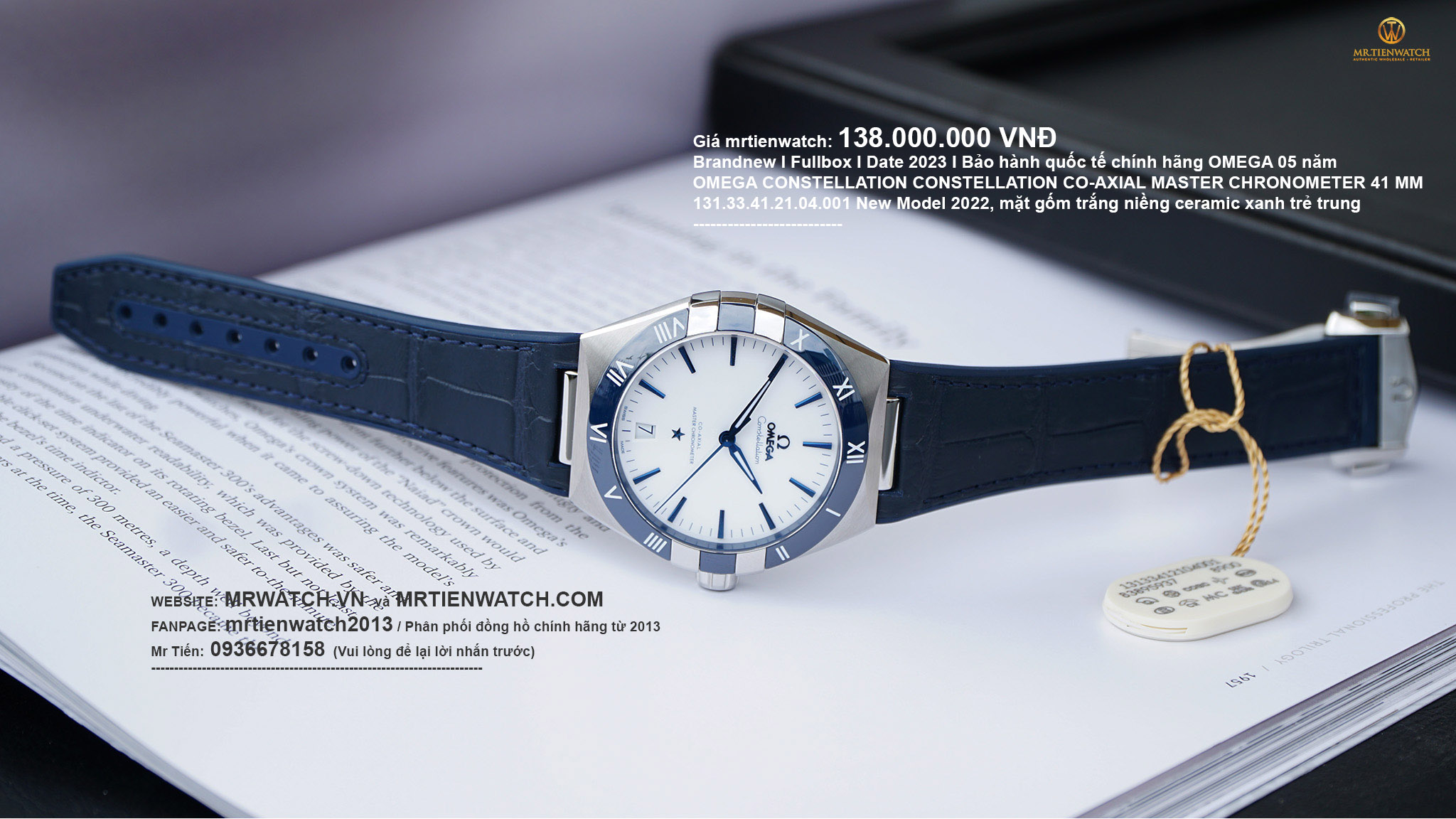 Thiết kế đặc biệt và độ bền ấn tượng của dòng OMEGA Constellation được đặc trưng bởi phong cách “Griffes” (phong cách móng vuốt) nổi tiếng. Mẫu đồng hồ OMEGA CONSTELLATION CO‑AXIAL MASTER CHRONOMETER 41 MM 131.33.41.21.04.001 (13133412104001) được chế tác từ thép không gỉ đường kính 41 mm, có mặt số màu bằng gốm Ceramic với cửa sổ hiển thị ngày ở vị trí 6 giờ. Viền bezel bằng gốm đánh bóng màu xanh lam với các chỉ số là các chữ số La Mã tráng men trắng "Grand Feu". Qua mặt sau trong suốt có thể thấy trái tim trung tâm của mẫu đồng hồ này , bộ chuyển động OMEGA Co-Axial calibre 8900.