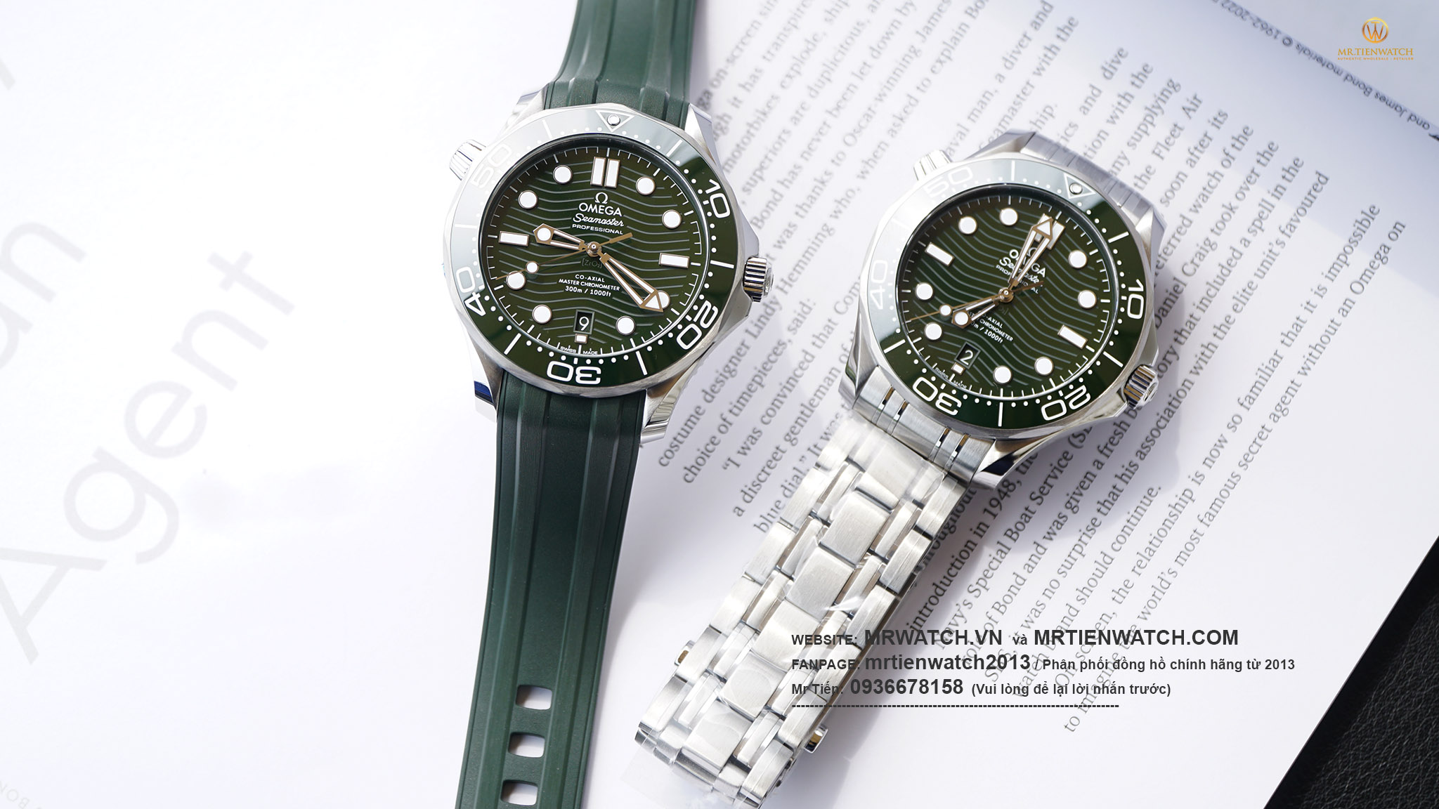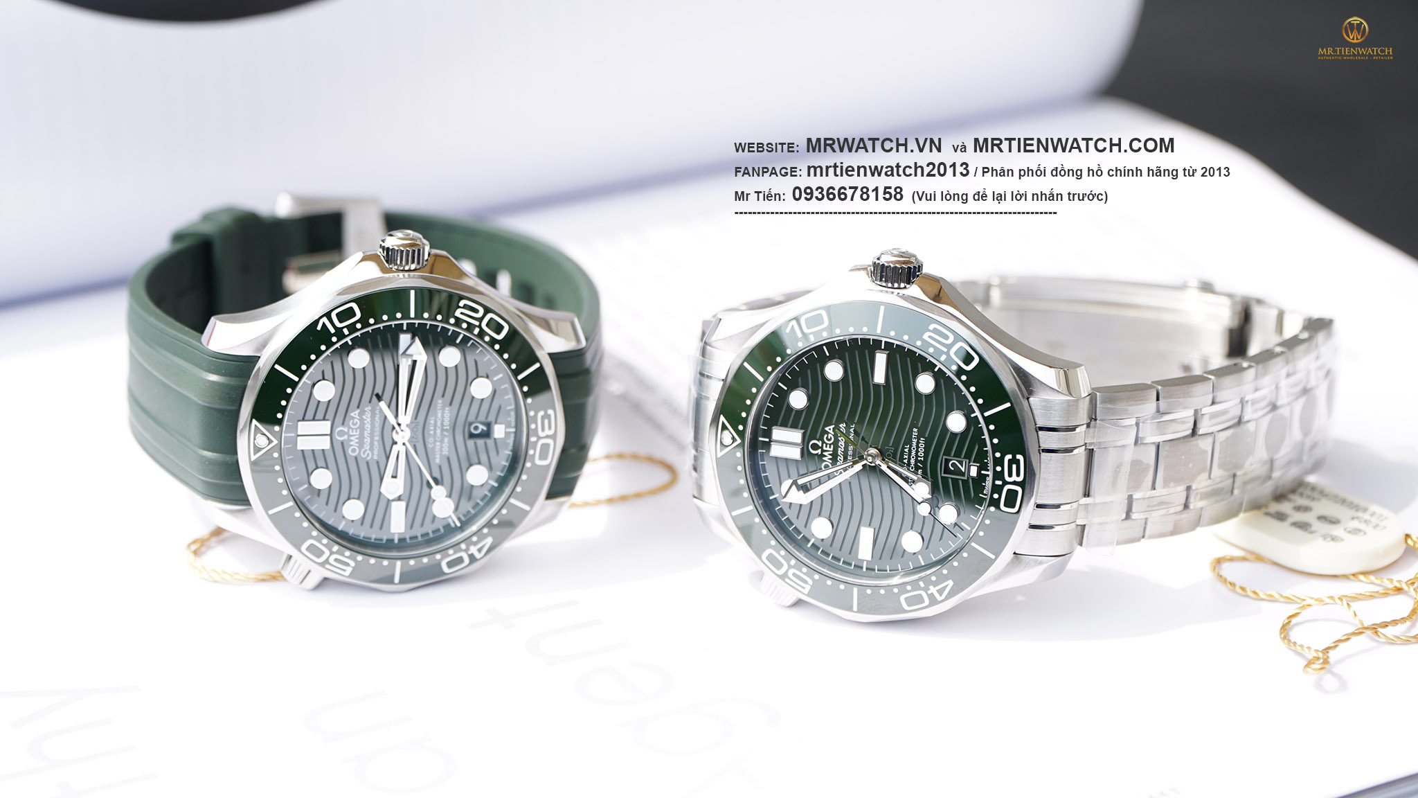 Mẫu đồng hồ Omega Seamaster Diver 300M mới với mặt số màu xanh lá cây có 2 phiên bản đi kèm dây cao su màu xanh lá với khóa chốt bằng thép ( 210.32.42.20.10.001) hoặc vòng đeo bằng thép với chốt gập (210.30.42.20.10.001. Với bản dây cao su sẽ có giá 5.400 EUR và 5.700 EUR đối với bản vòng đeo bằng thép không gỉ.
