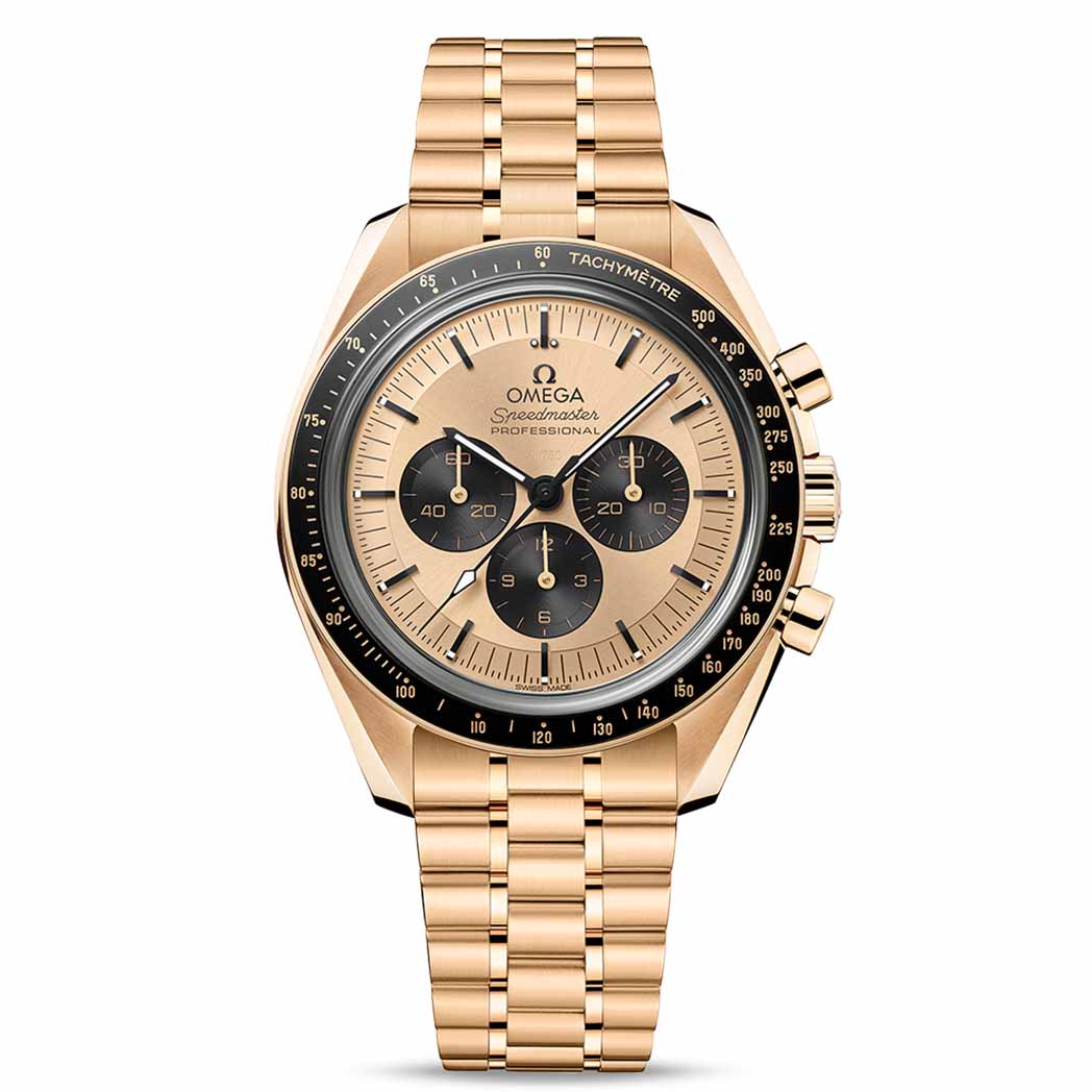 Là một trong những thiết kế mang tính biểu tượng của ngành công nghiệp đồng hồ Thụy Sĩ, Omega Speedmaster MoonWatch là những thiết kế chuyên dụng duy nhất đủ tiêu chuẩn trên tay các phi hành gia trong 6 lần du hành lên mặt trăng. Lấy cảm hứng từ Speedmaster thế hệ thứ 4, OMEGA SPEEDMASTER MOONWATCH PROFESSIONAL CO‑AXIAL MASTER CHRONOMETER CHRONOGRAPH 42 MM 310.60.42.50.99.002 (31060425099002) có mặt số bằng vàng Moonshine 18K được chải mịn tạo hiệu ứng ánh nắng mặt trời, các mặt số phụ và chỉ số giờ màu đen. Vòng bezel bằng gốm đen có thang đo tốc độ OMEGA Ceragold cùng toàn bộ dây đeo cũng là vàng Moonshine rực rỡ. Mặt sau bằng vàng 18K Moonshine đánh bóng có các đường vát và dòng chữ FIRST WATCH WORN ON THE MOON. Mẫu đồng hồ Moonwatch mới được trang bị bộ máy Co-Axial Master Chronometer Calibre 3861 với rất nhiều chi tiết bên trong cũng được đúc từ vàng khối.