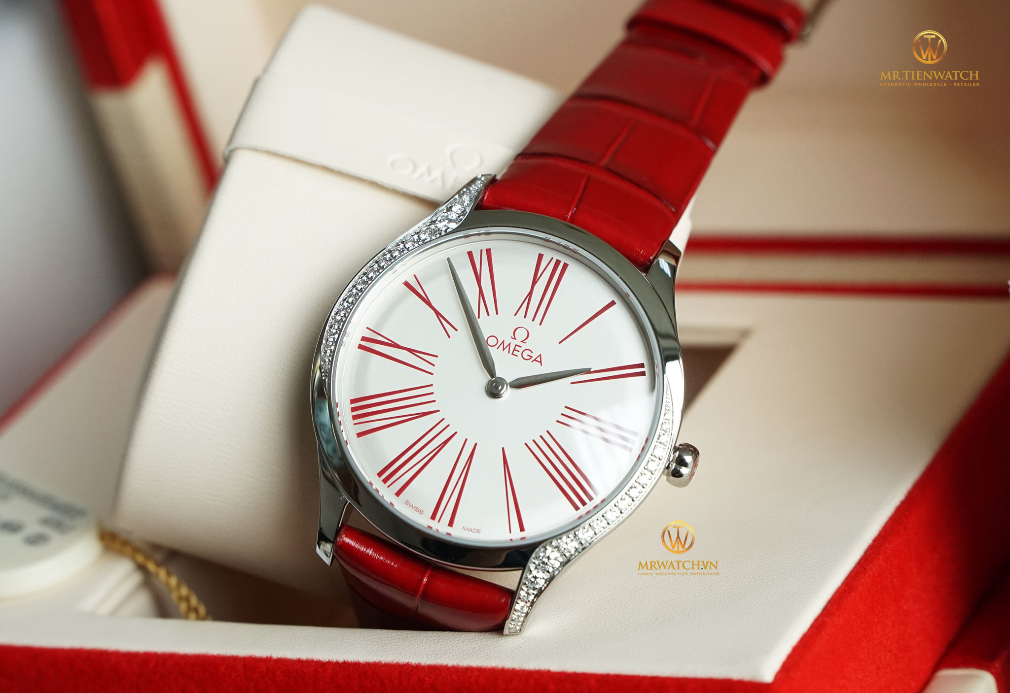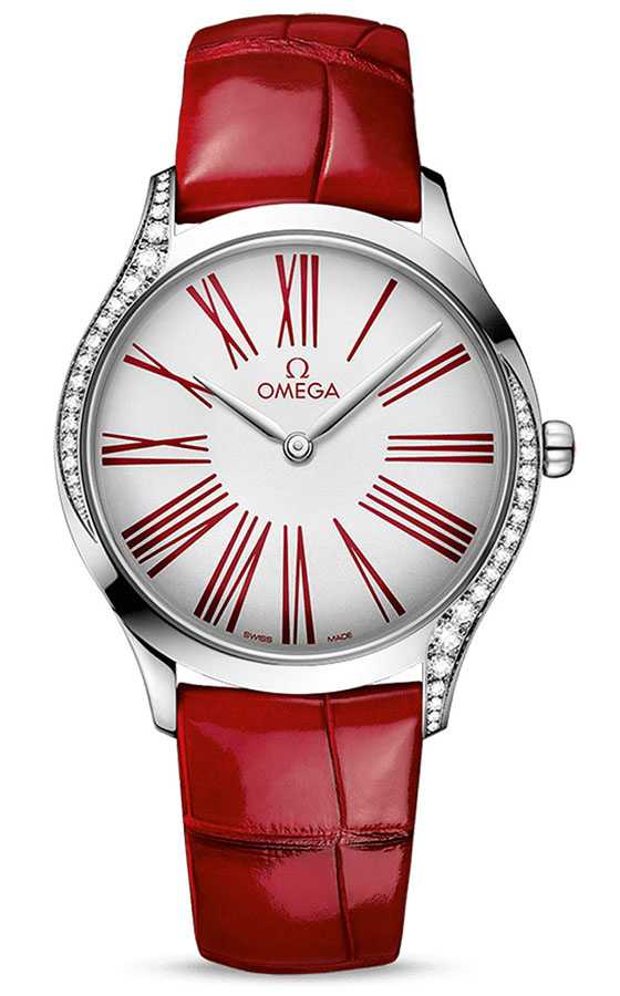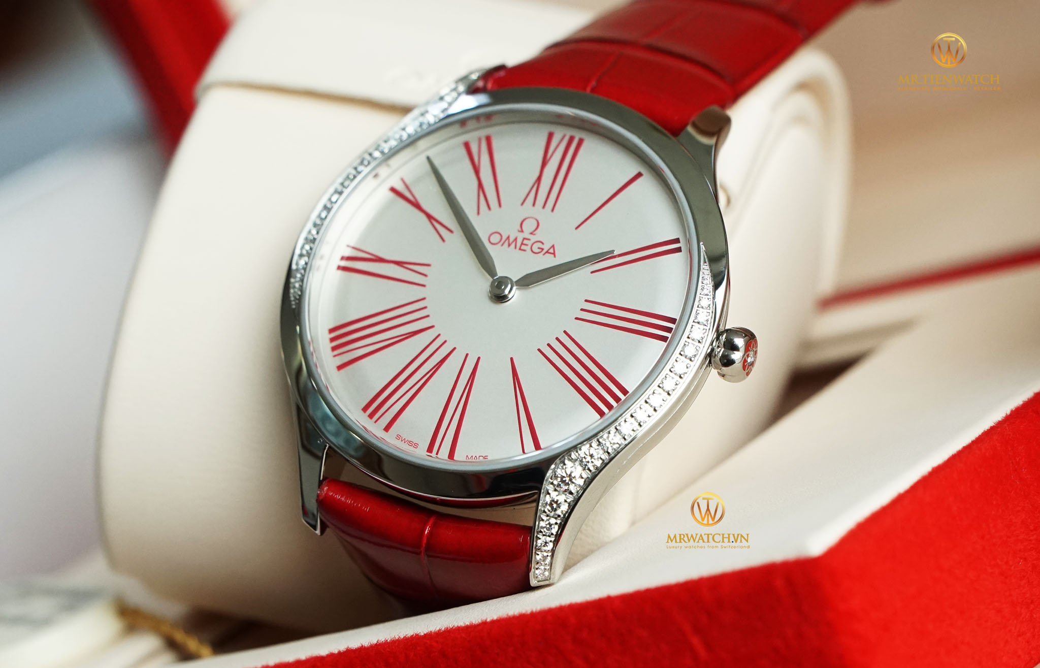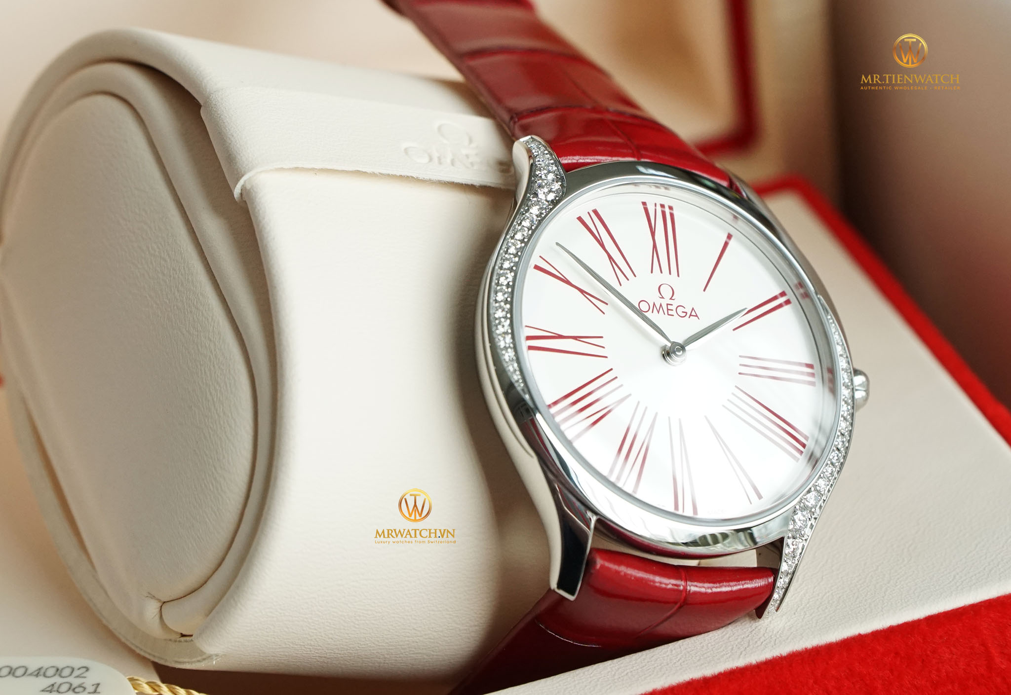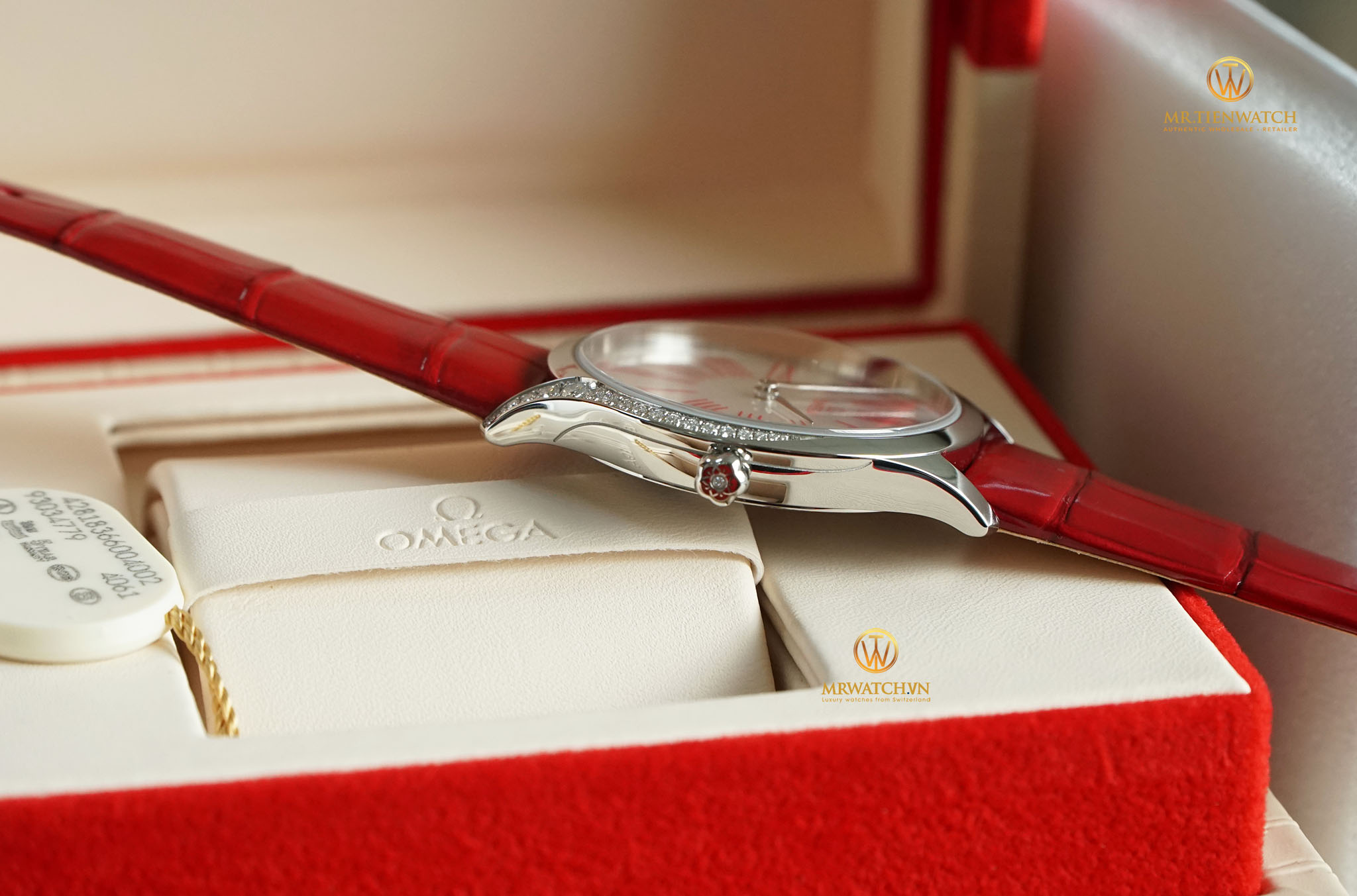 OMEGA có truyền thống lâu đời trong việc chế tác ra những mẫu đồng hồ tuyệt đẹp dành riêng cho phái nữ. Bộ sưu tập Trésor mang phong cách đương đại được thiết kế với góc cạnh tinh tế và sang trọng. Mẫu đồng hồ này được chế tác bằng thép không gỉ đường kính 36mm, lớp vỏ mỏng có đường cong thanh lịch được đính 38 viên kim cương dọc theo mỗi bên. Mặt số sơn mài màu trắng làm nổi bật các vạch chỉ giờ chữ La Mã màu đỏ, núm vặn đính kim cương được khắc 5 logo OMEGA tạo hình bông hoa. Trái tim chung tâm của mẫu đồng hồ này là bộ chuyển động OMEGA Calibre 4061. , đi kèm với dây đeo bằng da màu đỏ.