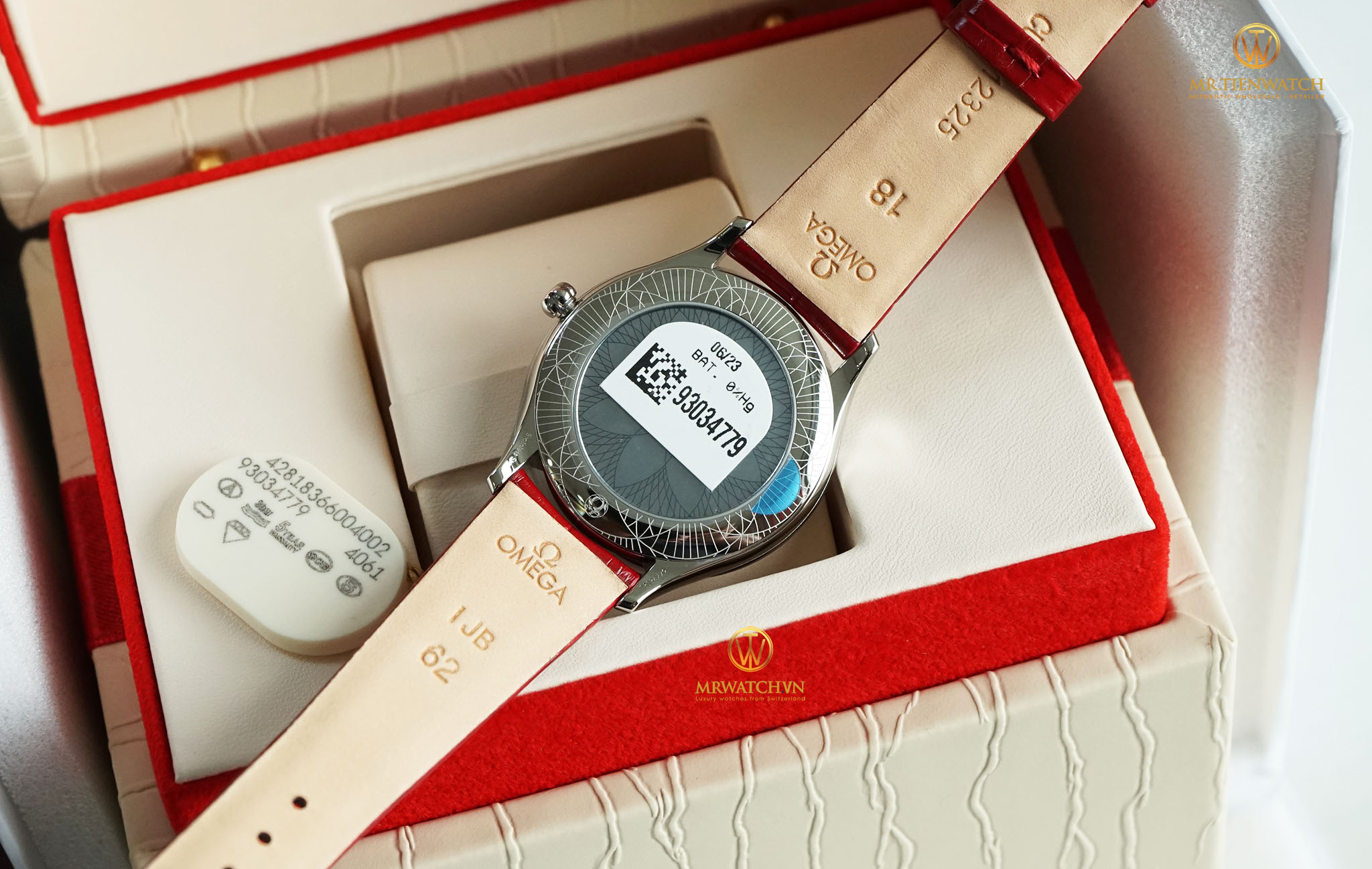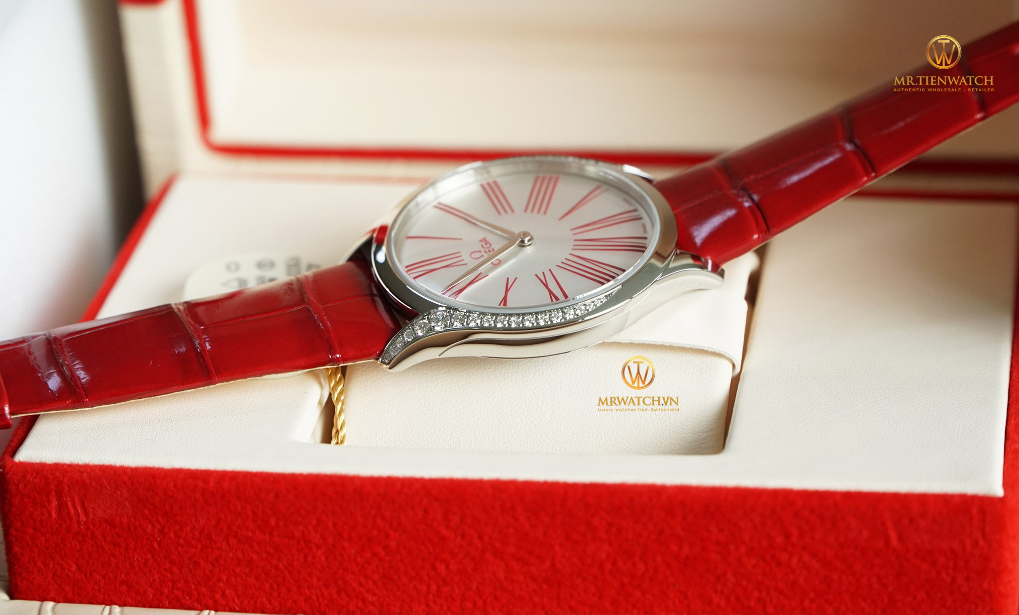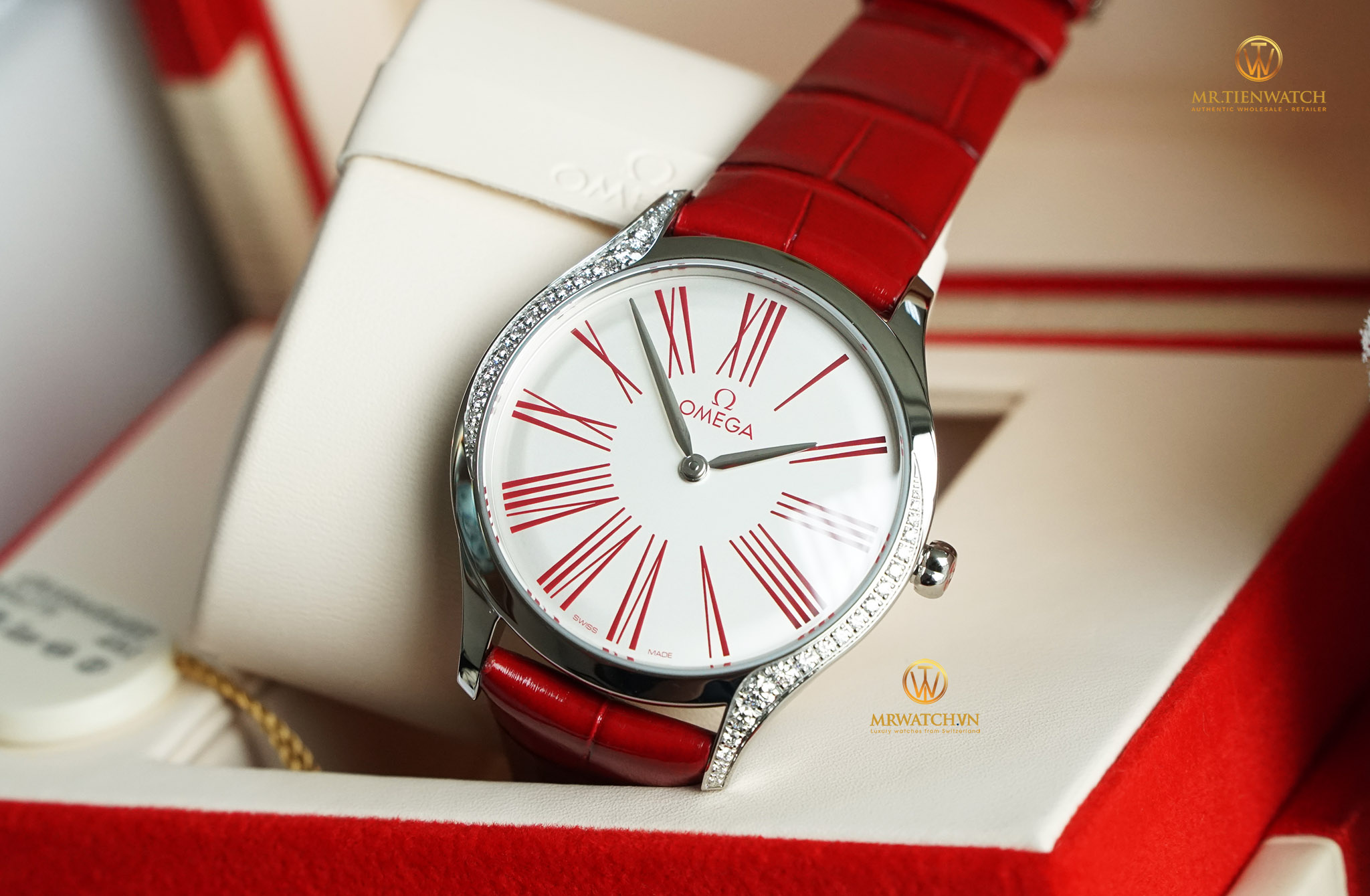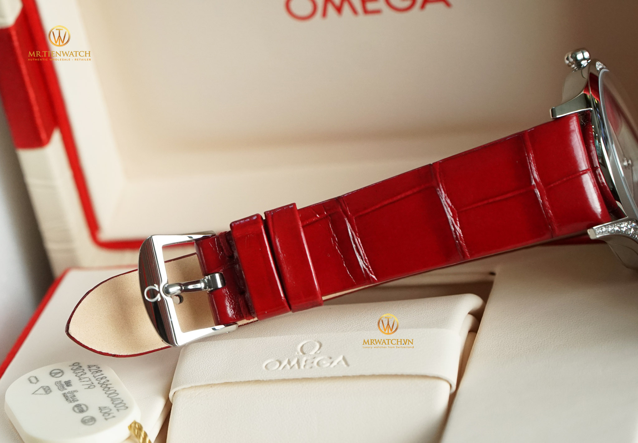 OMEGA có truyền thống lâu đời trong việc chế tác ra những mẫu đồng hồ tuyệt đẹp dành riêng cho phái nữ. Bộ sưu tập Trésor mang phong cách đương đại được thiết kế với góc cạnh tinh tế và sang trọng. Mẫu đồng hồ này được chế tác bằng thép không gỉ đường kính 36mm, lớp vỏ mỏng có đường cong thanh lịch được đính 38 viên kim cương dọc theo mỗi bên. Mặt số sơn mài màu trắng làm nổi bật các vạch chỉ giờ chữ La Mã màu đỏ, núm vặn đính kim cương được khắc 5 logo OMEGA tạo hình bông hoa. Trái tim chung tâm của mẫu đồng hồ này là bộ chuyển động OMEGA Calibre 4061. , đi kèm với dây đeo bằng da màu đỏ.