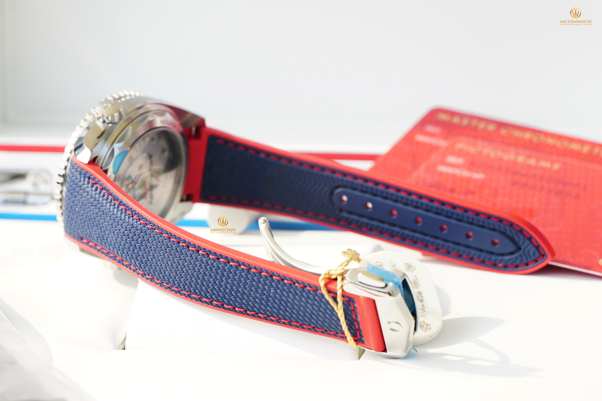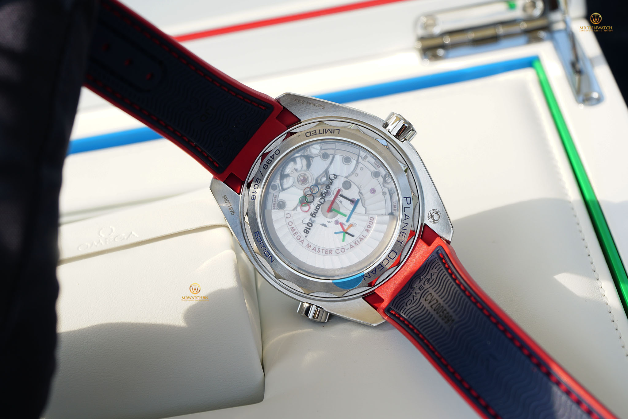 Bên cạnh mặt số và viền xoay bezel, cách phối màu xanh đỏ tương tự cũng được áp dụng trên dây đeo. Mẫu đồng hồ PyeongChang 2018 sử dụng dây đeo cao su màu xanh lam với lớp lót và các đường chỉ màu đỏ. Ngoài ra, bên trong bộ hộp đặc biệt còn đi kèm thêm một vòng đeo bằng thép không gỉ để thay đổi. Trên mặt lưng bằng tinh thể sapphire trong suốt của Omega Seamaster Planet Ocean 600m PyeongChang 2018 Limited Edition cũng mang đậm dấu ấn Olympic với dòng chữ “PyeongChang 2018” và biểu tượng Thế vận hội Olympic.