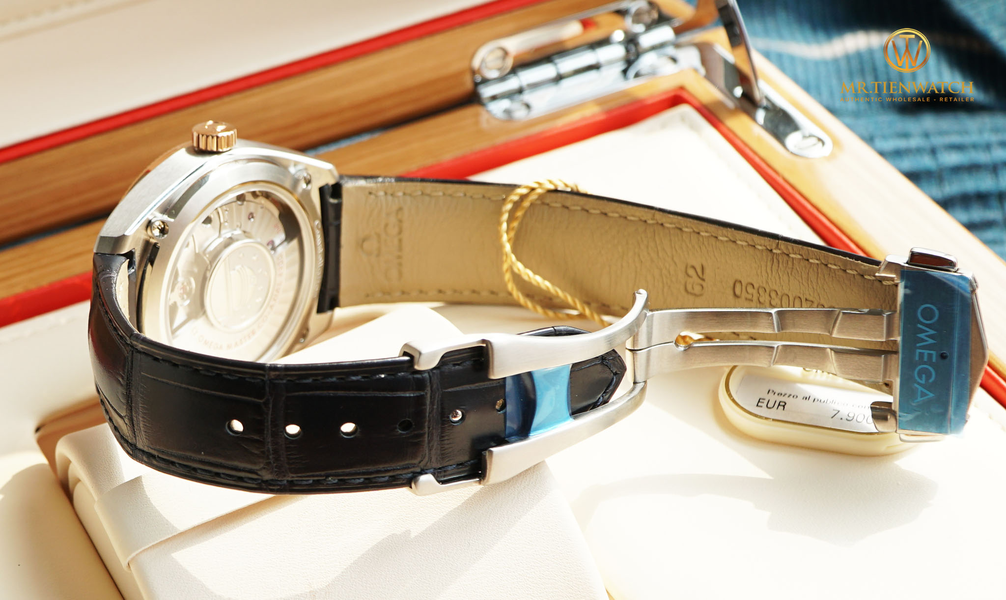 Phần cọc số cũng như bộ kim đều làm từ vàng và có gắn dạ quang siêu sáng. Các cọc số dạng nổi, vô cùng tương phản với mặt số màu xanh đậm, tôi cho rằng đây là chủ ý rất thông minh của hãng Omega vì cách làm này khiến cho mọi chi tiết đều tách biệt với nhau, việc xem giờ là vô cùng dễ dàng. Phần còn lại của thân vỏ còn lại là thép màu trắng, chúng được hoàn thiện kiểu xước mờ khá hiện đại, nắp đáy đằng sau được thiết kế theo dạng xuyên thấu giúp bạn có thể quan sát được cỗ máy bên trong ( tôi sẽ đề cập nó ở phần sau).