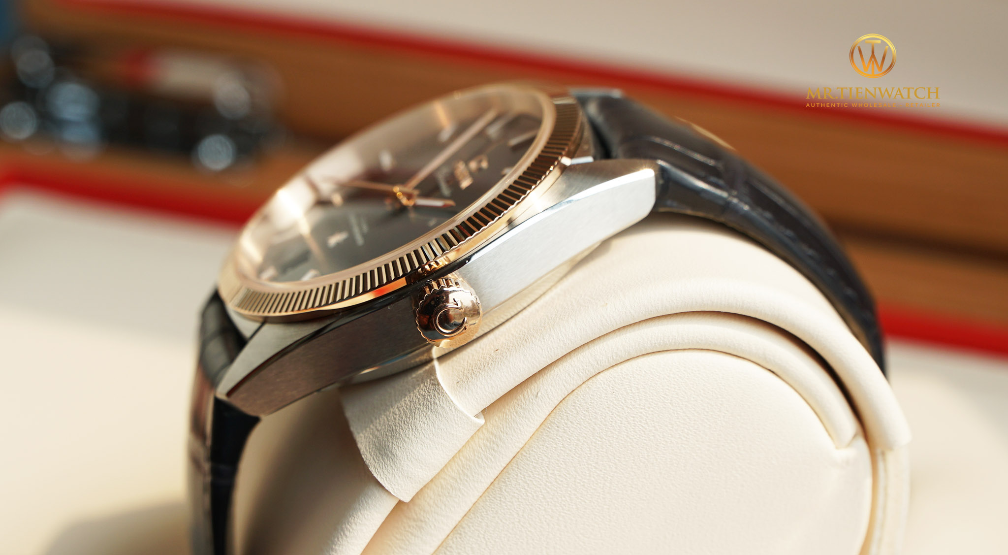 Ngay bên dưới lớp kính, chúng ta nhận ra một khuôn mẫu vô cùng quen thuộc từ những chiếc Constellation thời xưa, mặt số cắt vát 8 cạnh kiểu bát giác và một ngôi sao ngay góc 6 giờ - đó không chỉ là lịch sử mà còn là biểu trưng cho sức mạnh và tiền bạc. Mặt số trên mẫu đồng hồ này có màu xanh nước biển sẫm, cảm giác rất sâu màu và bắt sáng cực tốt, nó được chải tia trung tâm dạng sun-brush rất tuyệt vời.