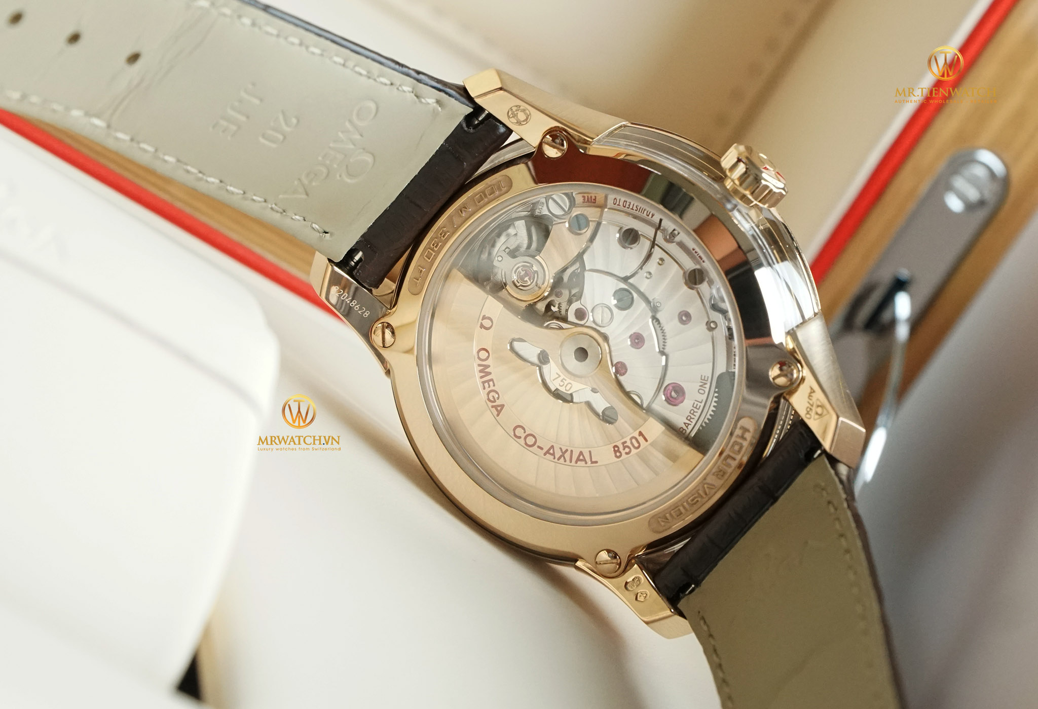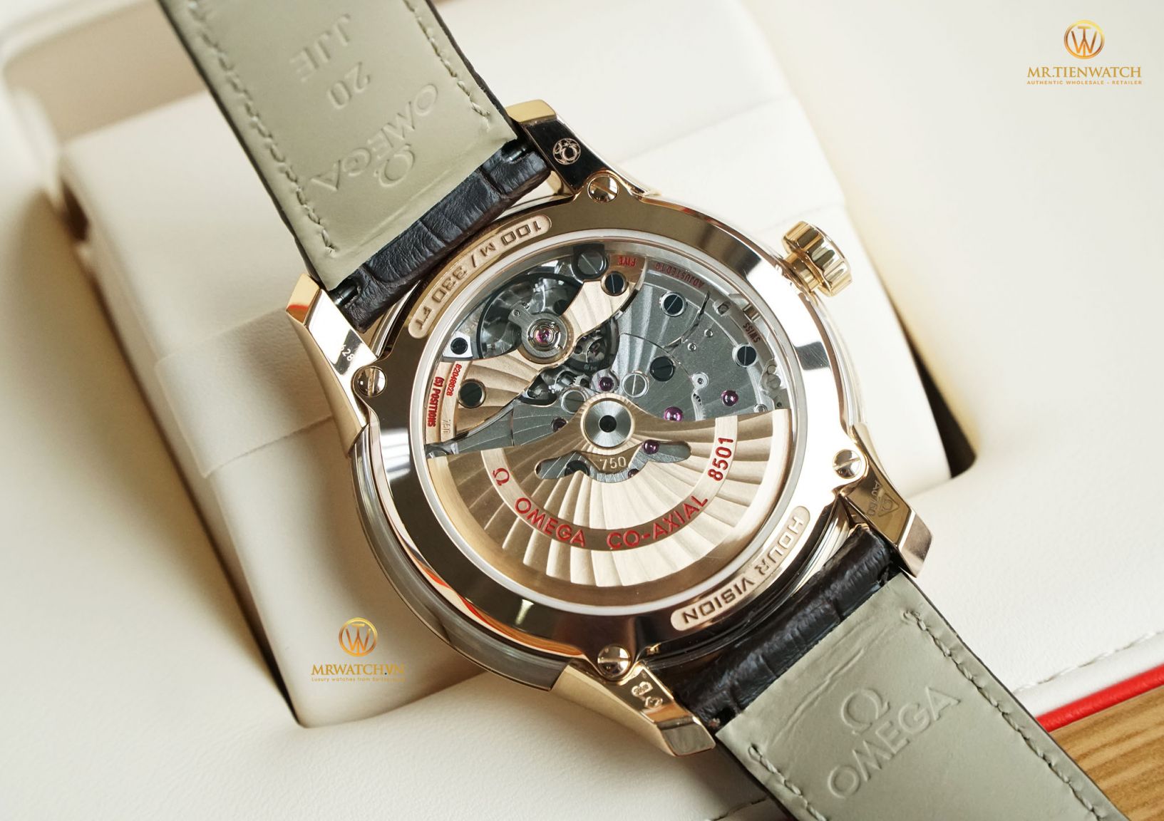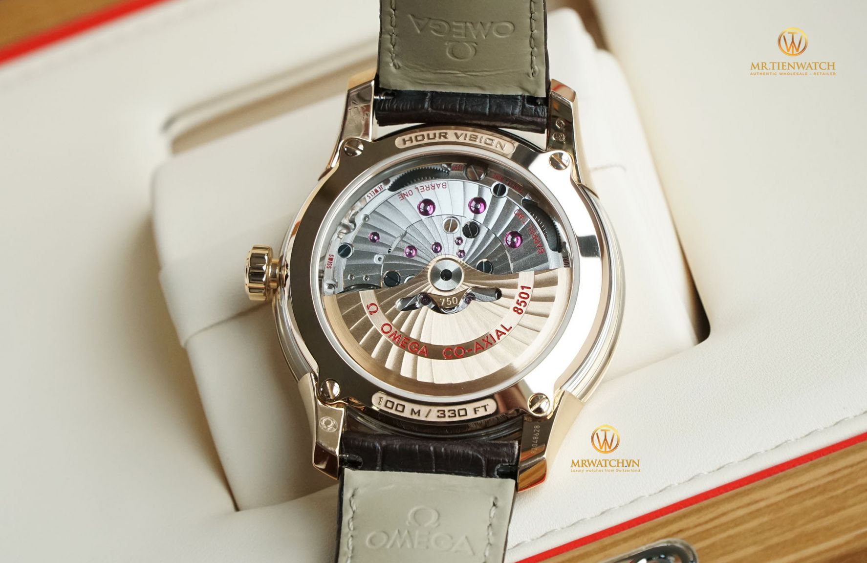 Sử dụng tới 02 ổ cót là Barel One và Barel Two, khả năng kháng từ 5000 Gauss... và đặc biệt ở cỗ máy Caliber 8501 trang bị trên chiếc Hourvision này là quả lăng và rotor đều được đúc từ vàng đặc nguyên khối, không đắt giá hơn mà khi chuyển động sẽ nặng hơn, quả lăng khi có lực sẽ văng mạnh hơn, cảm giác nặng tay hơn và có đà hơn rất nhiều. Ngay cả từng chi tiết trang trí trên bộ máy cũng rất tinh xảo, họa tiết vân xoắn ốc trên quả lăng, kí hiệu Hourvision cùng độ chịu nước 100 m cũng dược dập nổi sắc nét. Bốn càng đồng hồ đều có các kí hiệu về vàng như Au750, logo Omega, chiện vàng và serial sản phẩm, tất cả đều rất sắc nét.