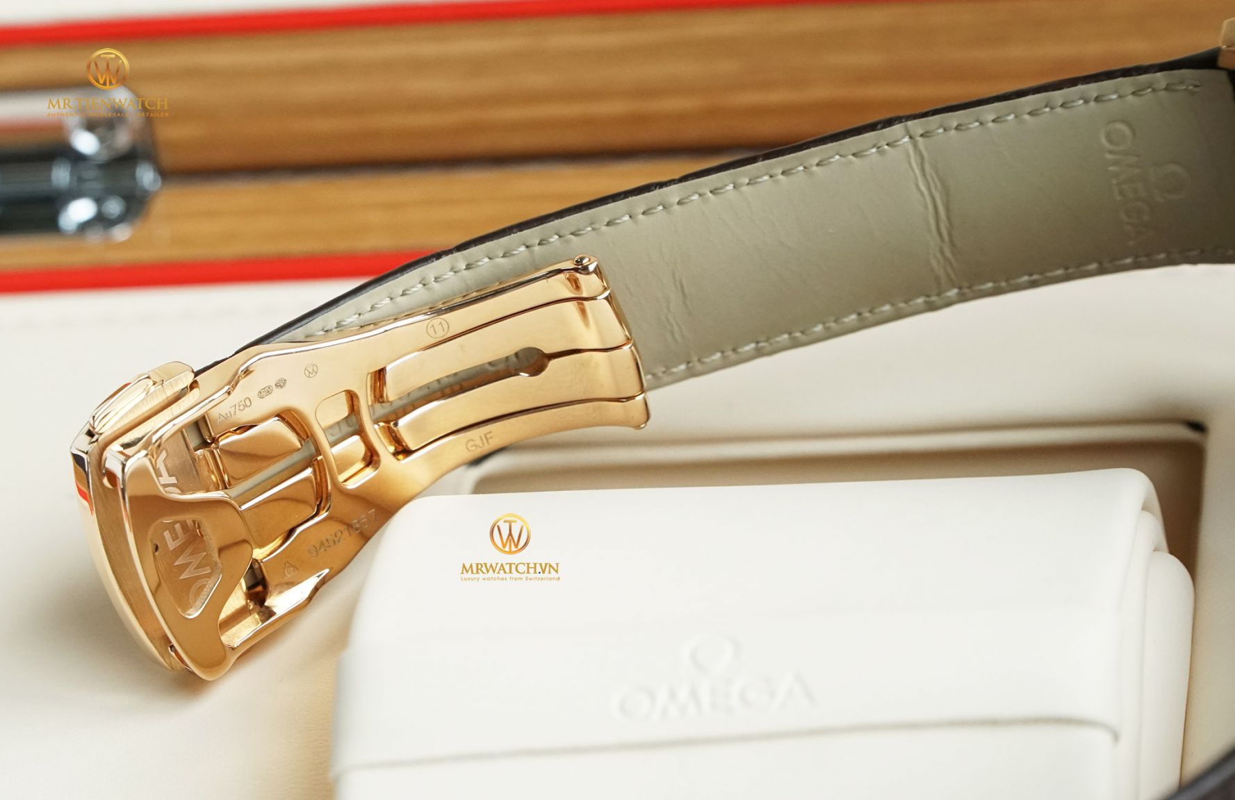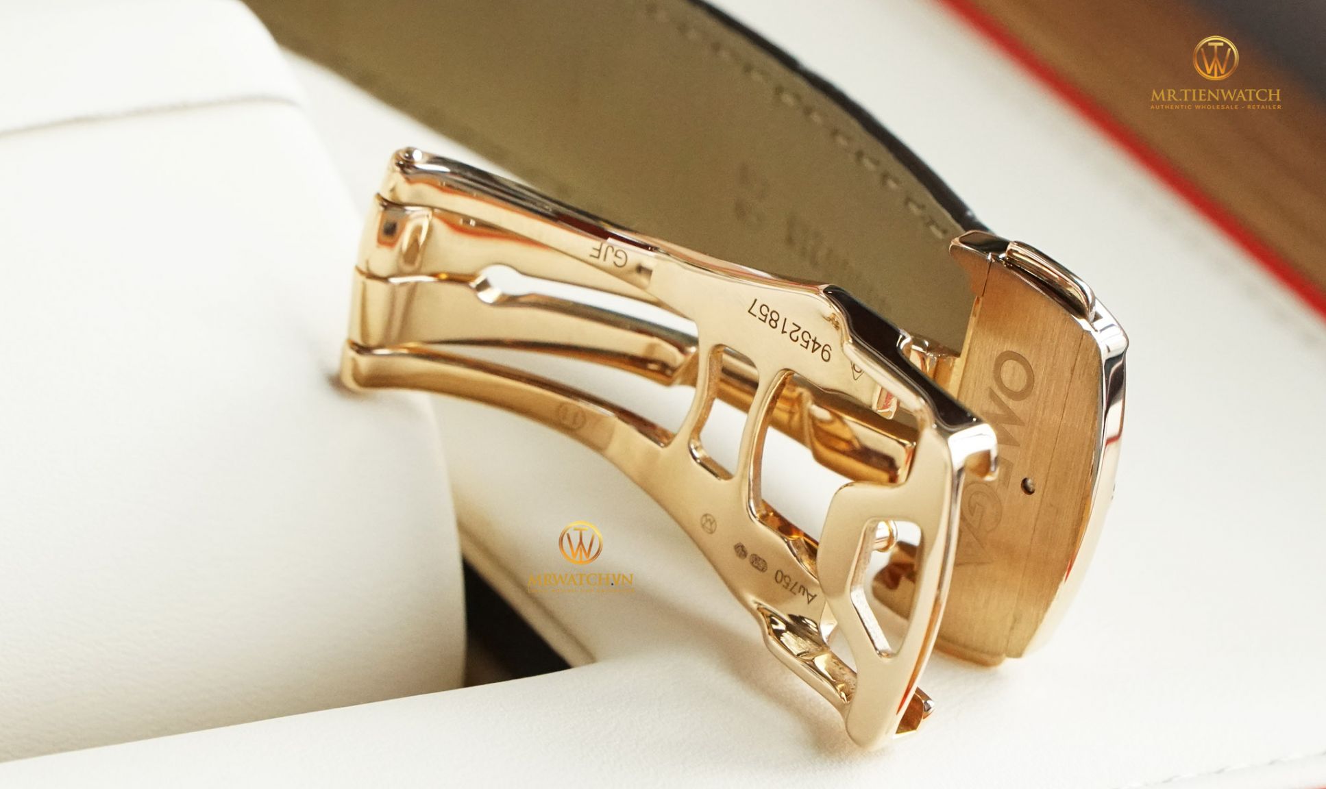 Trên khóa cũng có đầy đủ kí hiệu vàng Au750, triện vàng, logo Omega nổi cùng thiết kế 2 phần chải sước và làm mờ sang trọng tinh tế.