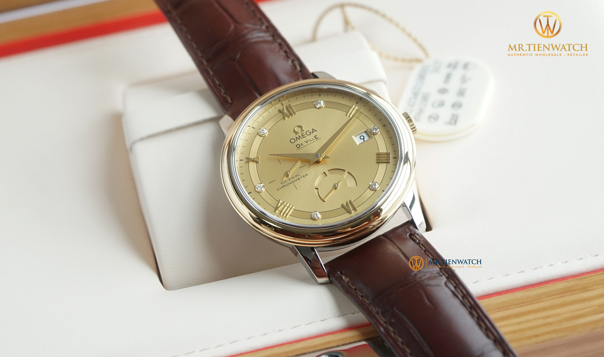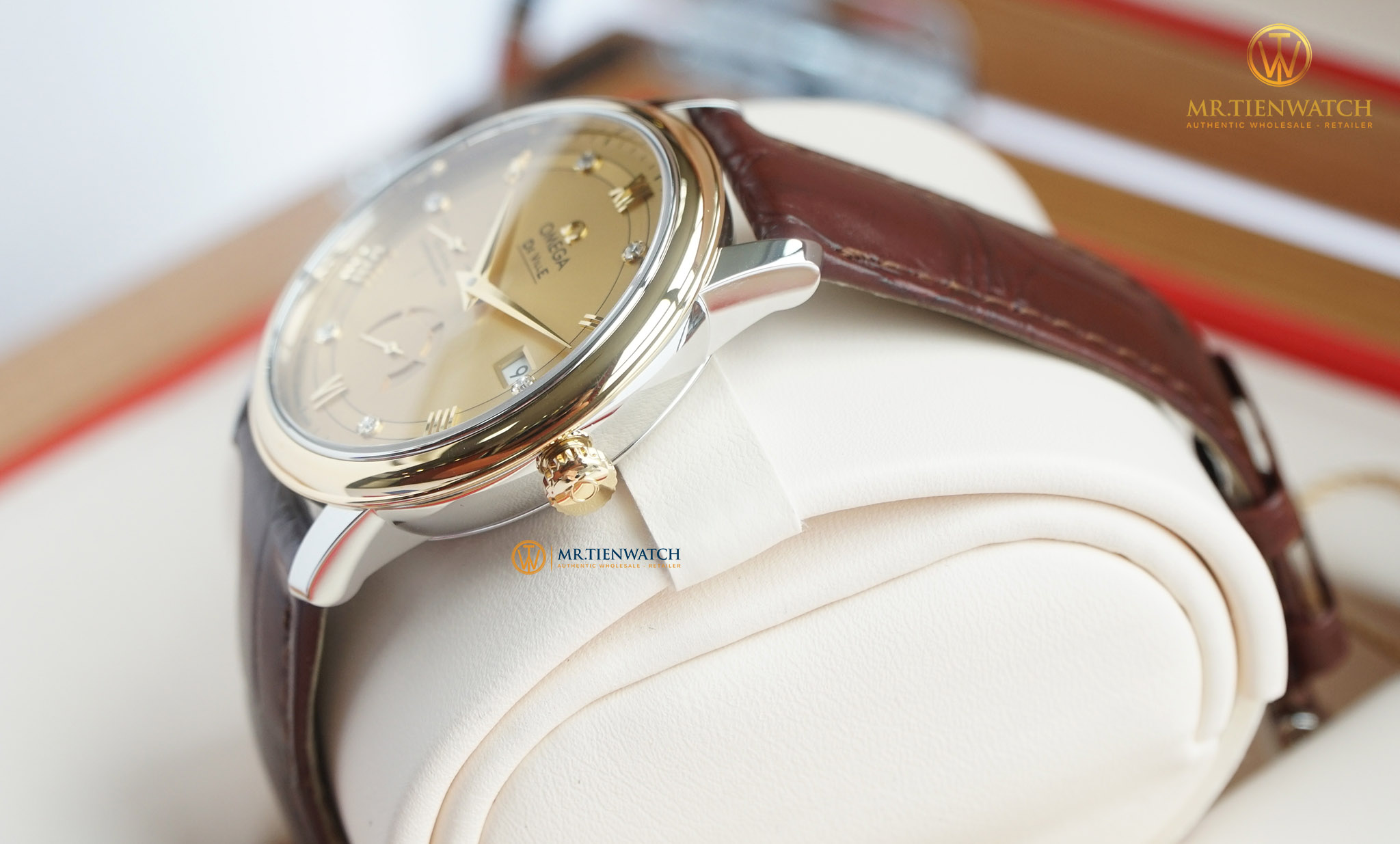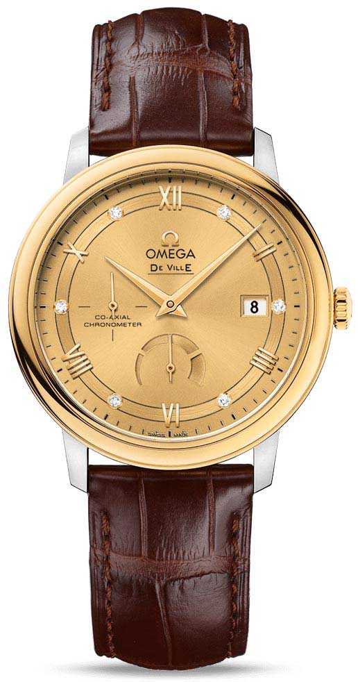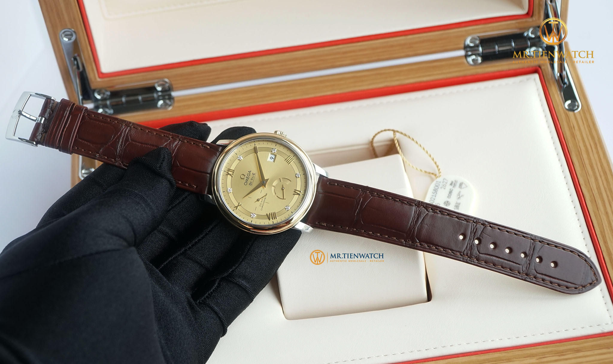 Bộ sưu tập OMEGA De Ville Prestige với thiết kế thanh lịch, cổ điển luôn thu hút một lượng lớn những Khách hàng trung niên, là những Chính Khách, Doanh nhân thành đạt hay đơn giản chỉ là yêu cầu sự sang trọng, tinh tế có chiều sâu và những mẫu đồng hồ De Ville Prestige cổ điển là một trong những lựa chọn không thể hoàn hảo hơn. Mã sản phẩm là OMEGA 424.23.40.21.58.001 có mặt số màu sâm banh hai tầng ấn tượng, chữ số La Mã được mạ vàng ở các vị trí 3, 6, 9 và 12 giờ. Mặt số được bảo vệ bởi lớp kính sapphire chống trầy xước với cửa sổ ngày ở vị trí 3 giờ và ô hiển thị mức dự trữ năng lượng ở vị trí 6 giờ. Toàn bộ vỏ được làm bằng vàng nguyên khối kết hợp thép không gỉ cao cấp có đường kính mặt là 39.5 mm, kết hợp hoàn hảo cùng dây da cá sấu màu nâu. Trái tim trung tâm cung cấp năng lượng cho mẫu đồng hồ này là bộ chuyển động Calibre 2627 Co-Axial đạt chuẩn Chronometer chính xác.