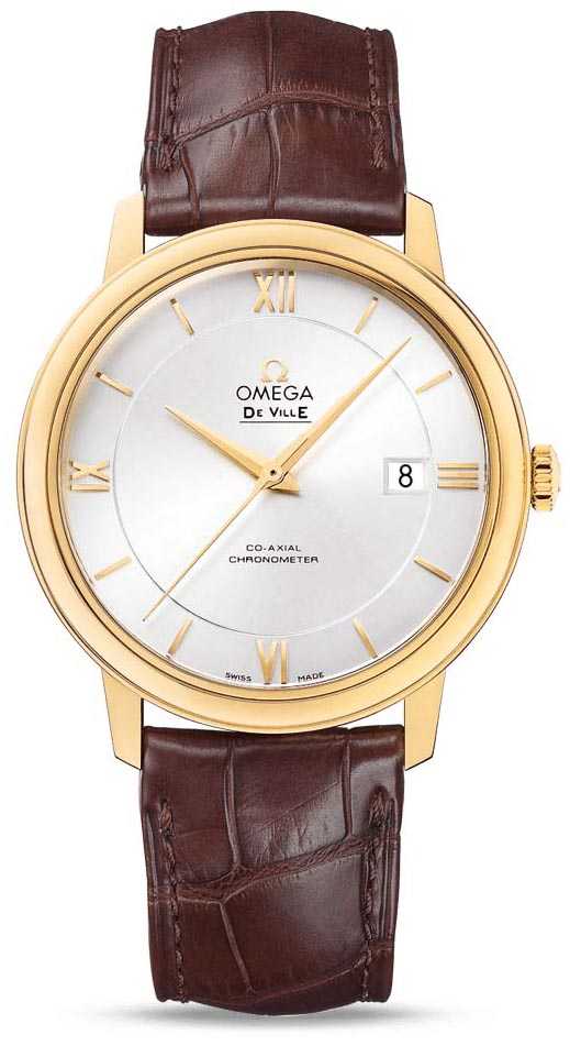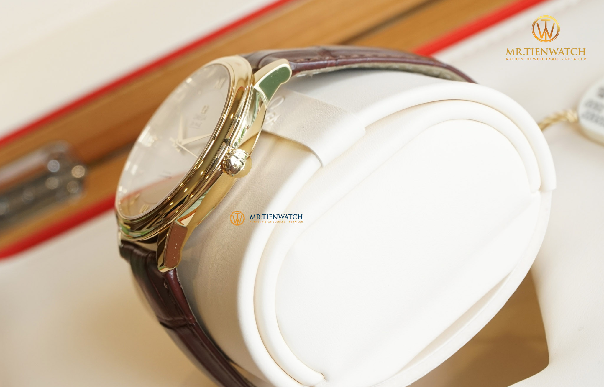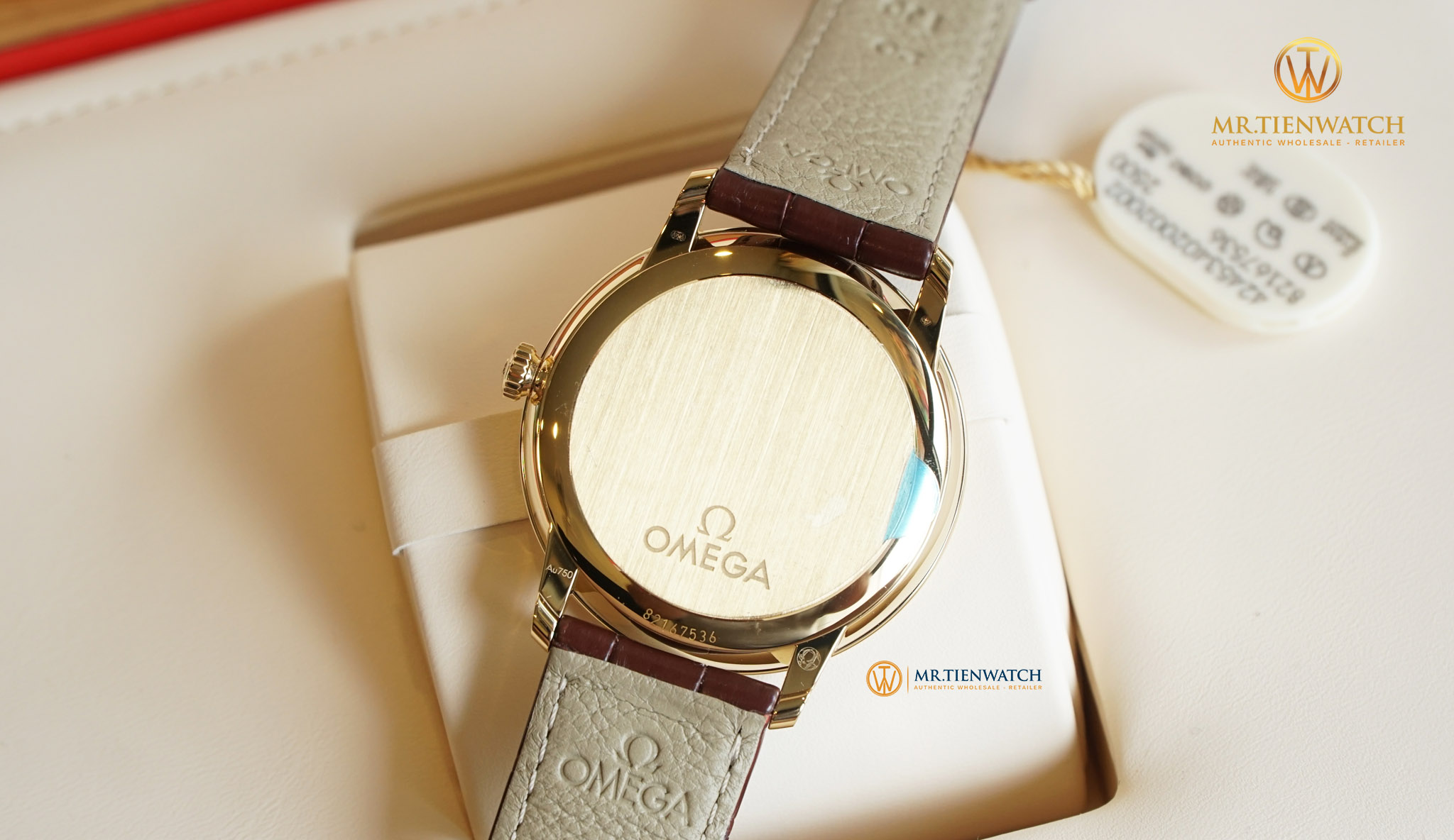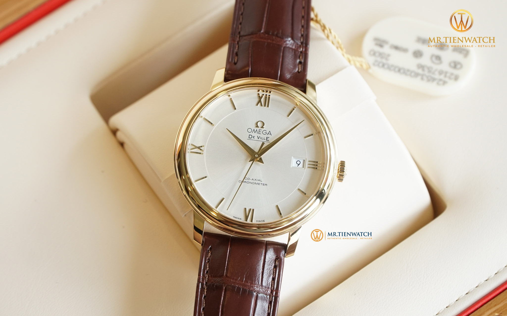 Bộ sưu tập OMEGA De Ville Prestige với thiết kế thanh lịch, cổ điển luôn thu hút một lượng lớn những Khách hàng trung niên, là những Chính Khách, Doanh nhân thành đạt hay đơn giản chỉ là yêu cầu sự sang trọng, tinh tế có chiều sâu và những mẫu đồng hồ De Ville Prestige cổ điển là một trong những lựa chọn không thể hoàn hảo hơn. Mã sản phẩm là OMEGA 424.53.40.20.02.002 có mặt số màu trắng bạc hai tầng ấn tượng, chữ số La Mã được mạ vàng ở các vị trí 3, 6, 9 và 12 giờ. Mặt số được bảo vệ bởi lớp kính sapphire chống trầy xước với cửa sổ ngày ở vị trí 3 giờ. Toàn bộ vỏ được làm bằng vàng nguyên khối có đường kính mặt là 39.5 mm, kết hợp hoàn hảo cùng dây da cá sấu màu nâu. Trái tim trung tâm cung cấp năng lượng cho mẫu đồng hồ này là bộ chuyển động Calibre 2500 Co-Axial đạt chuẩn Chronometer chính xác.