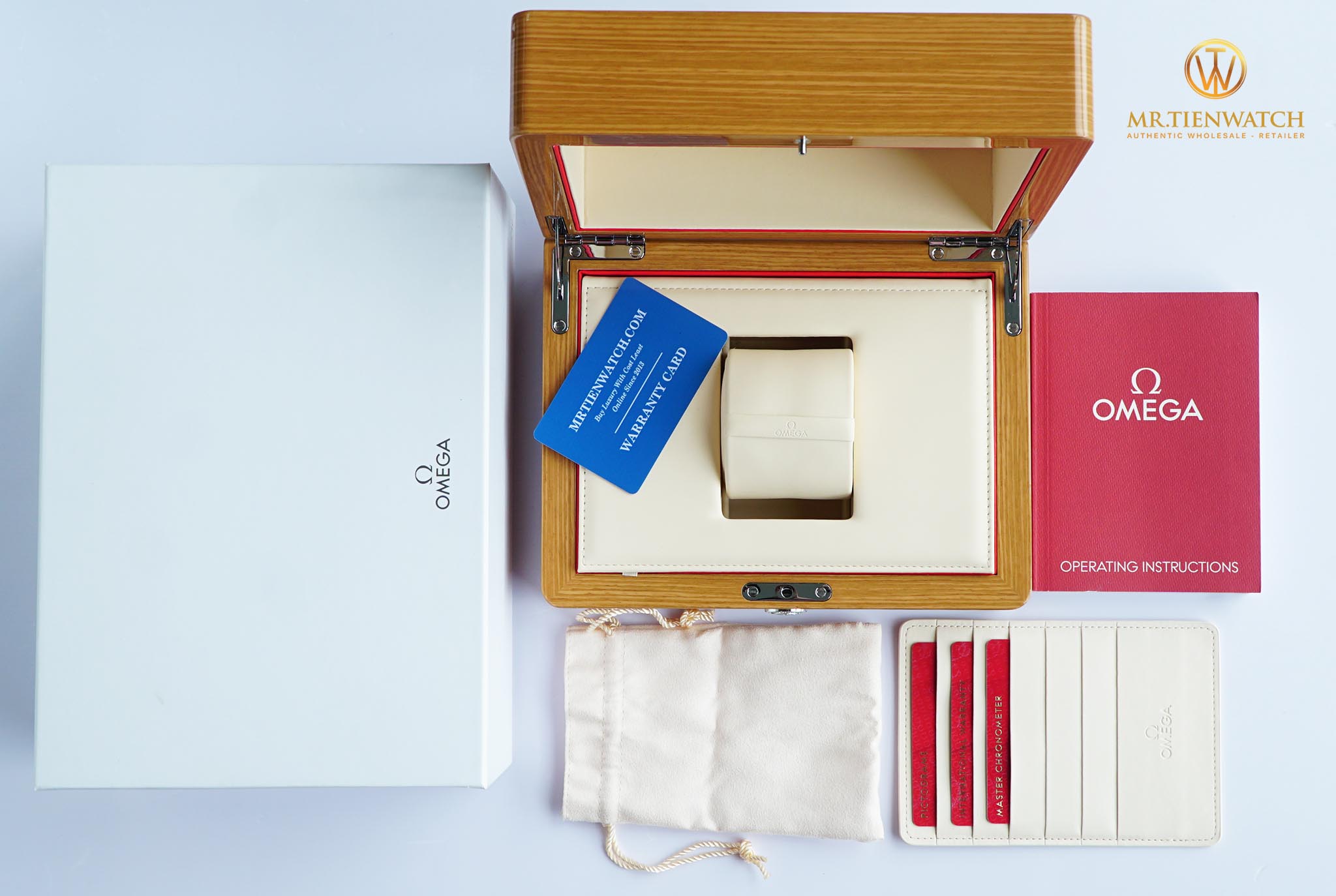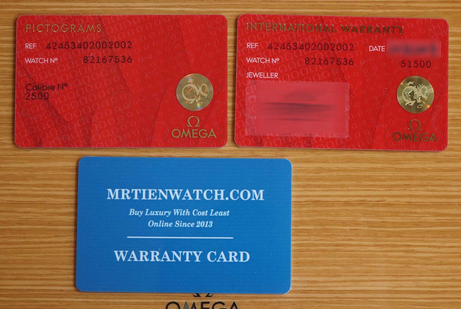 Trước khi đi vào review phần mặt số đồng hồ, chúng tôi muốn nhấn mạnh lại là với bất kì mẫu Omega nào khách hàng đặt mua tại mrtienwatch thì 100% đều là hàng chính hãng, mới tinh, đầy đủ hộp sổ thẻ quốc tế đi kèm. Như sản phẩm dưới đây là serial là 82167536 trùng khớp với thẻ bảo hành quốc tế, thẻ có dấu của Đại Lý Phân Phối Quyền Quốc Tế (xin lỗi chúng tôi buộc phải làm mờ) nên sản phẩm sẽ được hưởng đầy đủ chính sách bảo hành chung của Hãng lên tới 05 năm, chỉ cần mang thẻ và đồng hồ ra bất kì một Đại Lý phân phối chính hãng Omega nào trên Thế Giới là có thể được hỗ trợ đầy đủ.