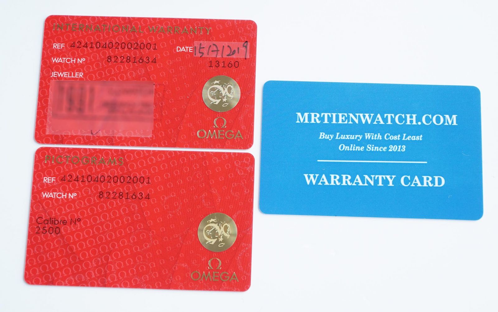 BẢO HÀNH QUỐC TẾ CHÍNH HÃNG OMEGA 05 NĂM : Với tất cả đồng hồ Omega chúng tôi bán ra đều là sản phẩm phân phối bởi các Đại Lý Ủy Quyền Quốc Tế Chính Hãng, vì vậy sản phẩm được hưởng đầy đủ chính sách bảo hành chung của Hãng lên tới 05 năm, bao gồm cả Hãng ở Việt Nam, trên thẻ bảo hành có đóng dấu của đại lý phân phối cũng như ngày bán ra, số thẻ phải trùng với số serial trên đồng hồ.