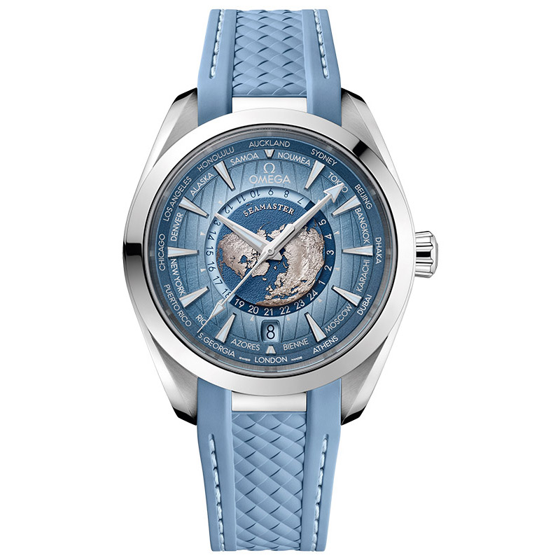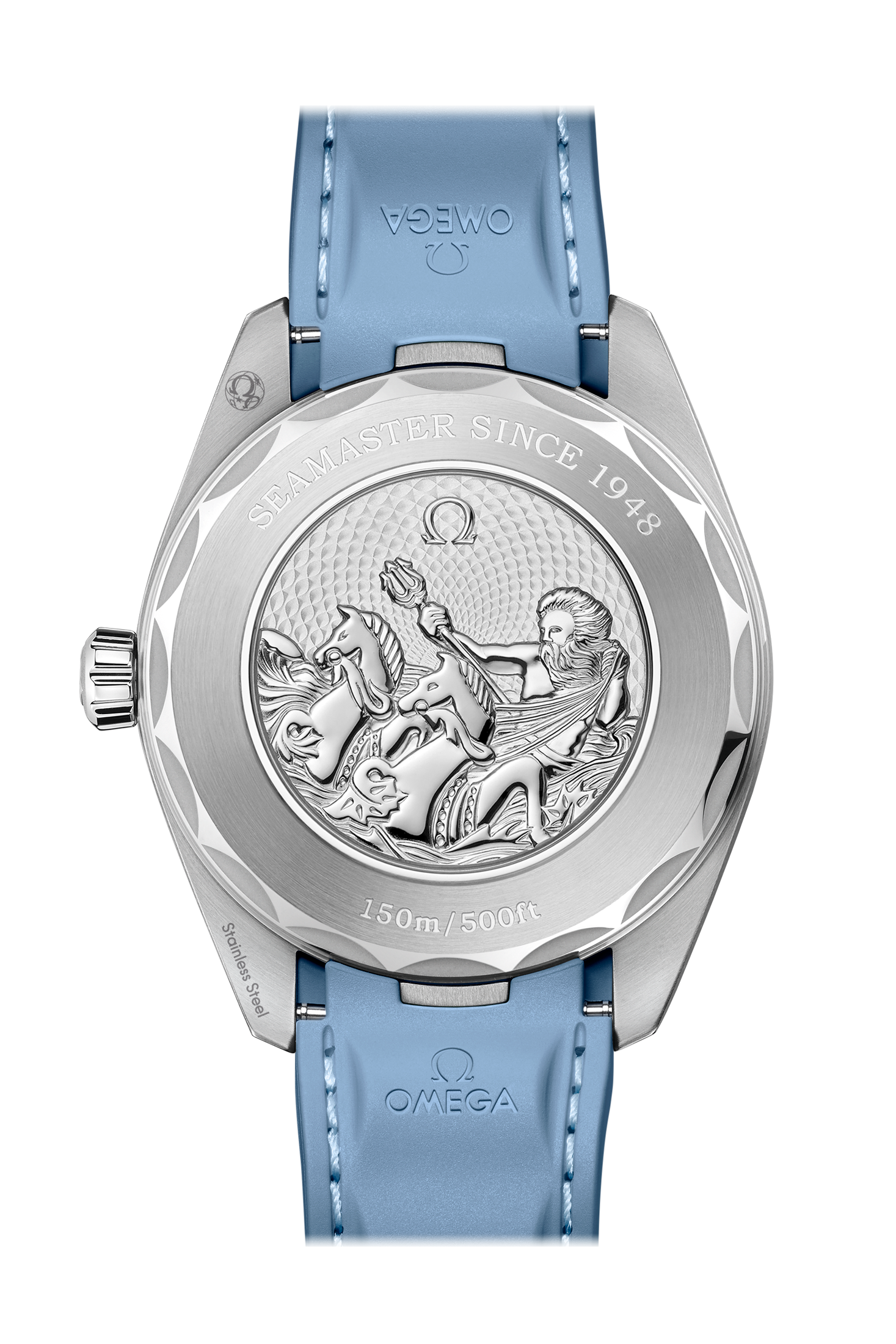 AquaTerra Worldtimer 2023 Summer Blue 220.12.43.22.03.002 tuyệt vời với mặt số địa cầu, công nghệ đốt laze độc nhất nay đã có thêm mặt số xanh lam ấn tượng, và những phiên bản kỉ niệm này có nắp đáy khắc họa vị thần Poseidon cầm chiếc đinh ba và cưỡi trên hai con hải mã, đây là logo nguyên bản vào năm 1956 của dòng Seamaster huyền thoại.