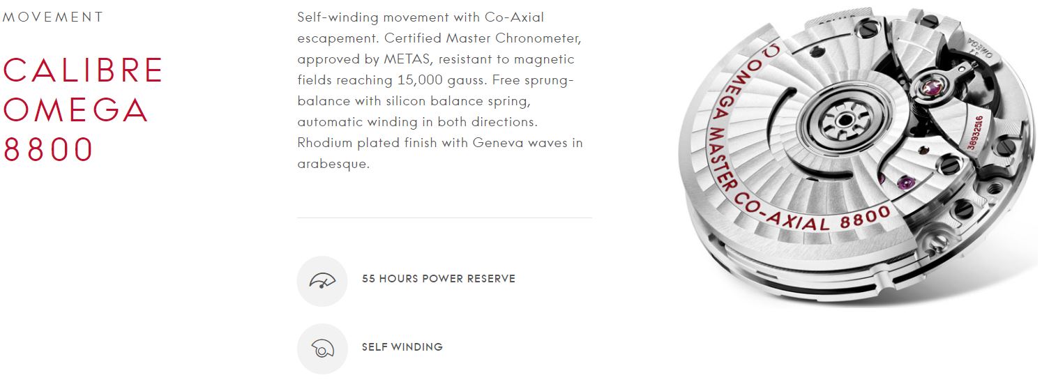 + Bộ chuyển động: in-house Calibre 8800, đạt Chứng nhận Master Chronometer METAS - tần số dao động 25.000vph với bộ thoát khí Co-Axial - dự trữ năng lượng 55 giờ