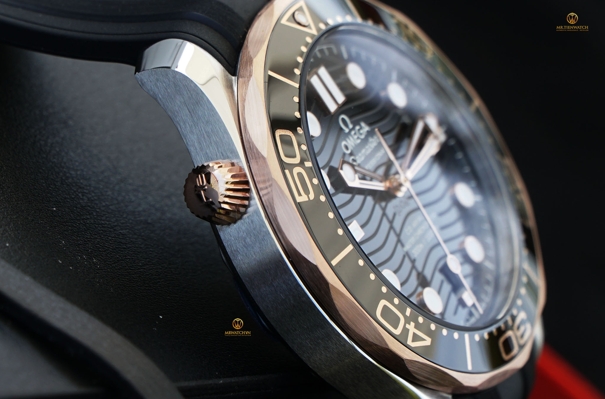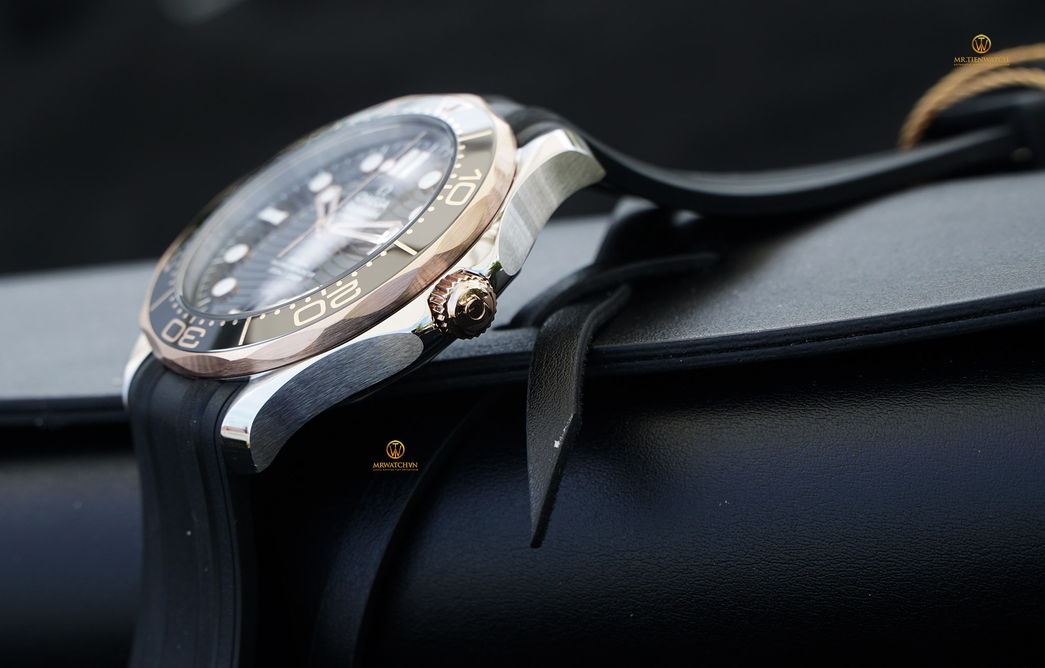 Một chút thay đổi nhỏ ở phần niềng, núm chỉnh giờ và van heli đã khiến thiết kế này trong " sang" hơn rất nhiều, lộng lẫy dưới ánh sáng và thu hút mọi ánh nhìn. Cũng có nhiều ý kiến cho rằng " vàng" làm yếu đi phong cách thể thao đặc trưng của SeaMaster 300 nhưng bản thân tôi lại khá thích thú với vàng, rõ ràng lên tay sẽ sang trọng và đẳng cấp hơn nhiều, đặc biệt khi xu hướng đồng hồ công sở đang thịnh hành như hiện nay.
