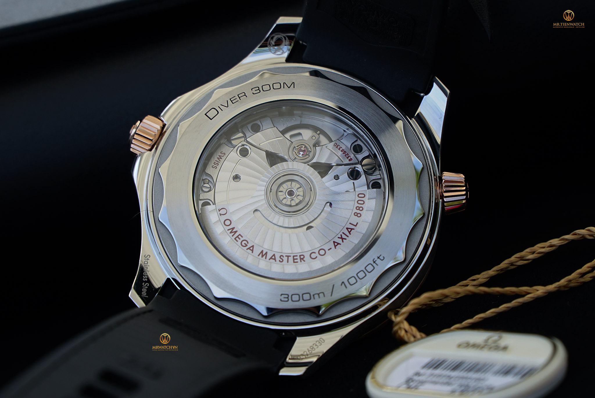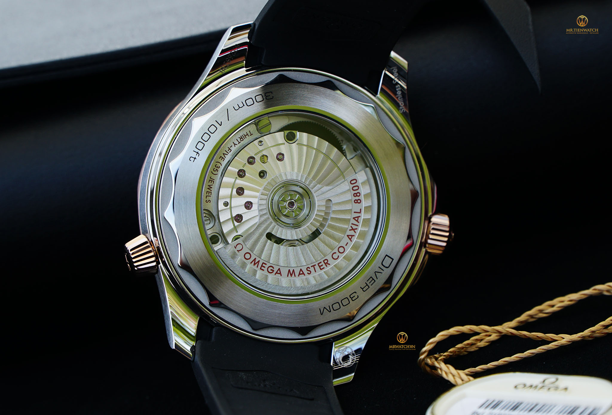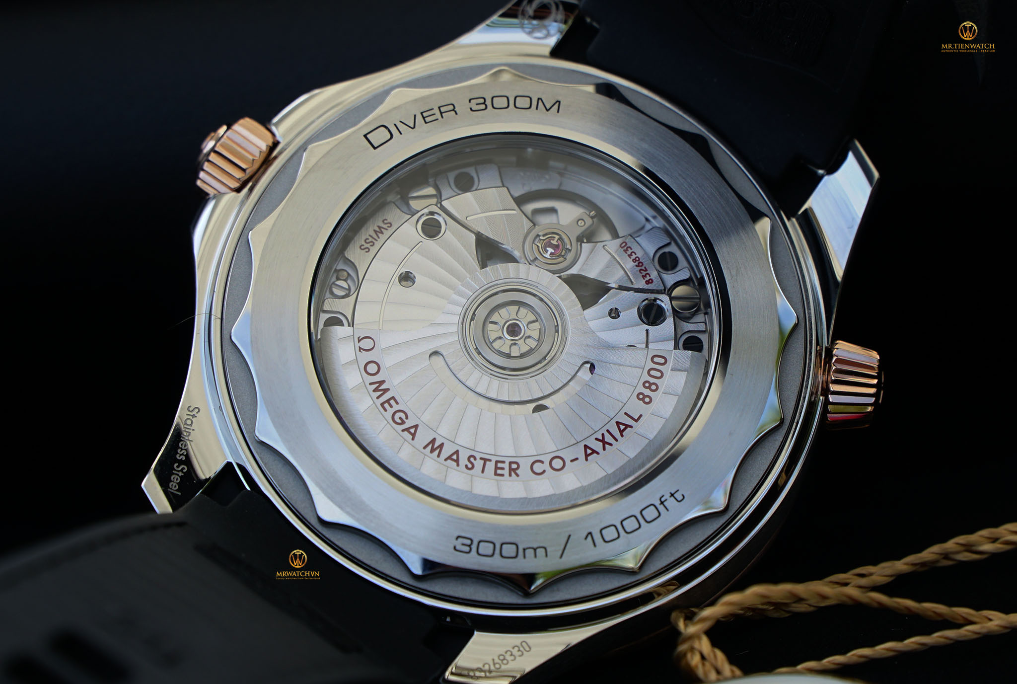 Chỉ là vấn đề thời gian trước khi Omega bắt đầu sử dụng một trong những bộ chuyển động được họ tự phát triển và sản xuất. Bộ chuyển động này chứa đựng tất cả những đổi mới và công nghệ tiên tiến nhất mà Omega đã giới thiệu: Lò xo cân bằng silicon Si14, chống từ lên đến 15.000 gauss và dự trữ năng lượng trong 55 giờ. Tất nhiên, bộ chuyển động này cũng có công nghệ co-axial, nhưng được cải thiện so với chuyển động được tìm thấy trong bộ chuyển động caliber 2500. Trong chiếc đồng hồ Seamaster 300M Diver mới, bạn có thể nhìn thấy calibre 8800 ở mặt sau qua vỏ kính sapphire.