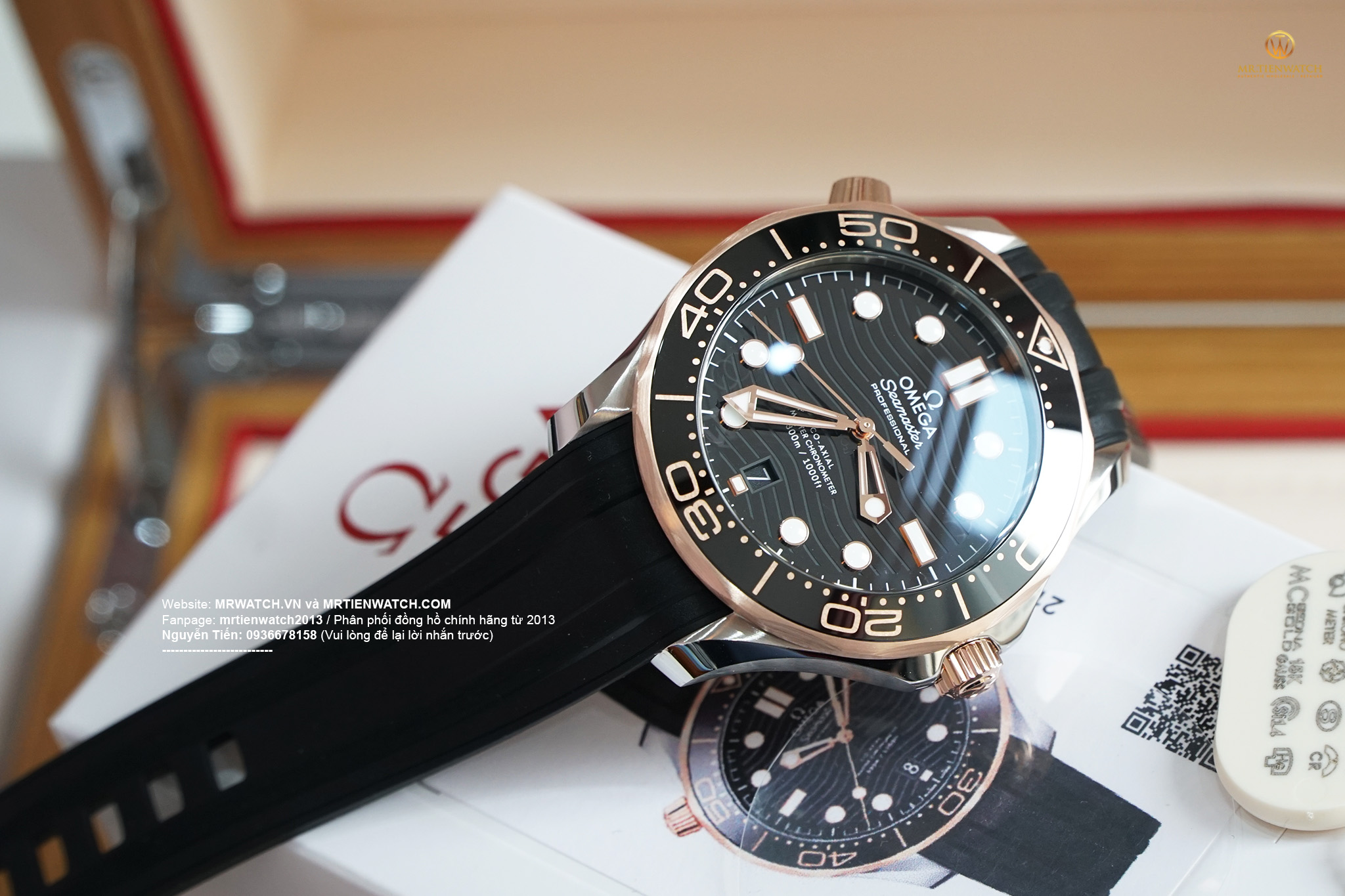 OMEGA SEAMASTER DIVER 300M CO‑AXIAL MASTER CHRONOMETER 42 MM 210.22.42.20.01.002 được chế tác từ thép không gỉ kết hợp với vàng đỏ Sedna 18K độc quyền, có khung viền bằng gốm và thang chia thời gian lặn Ceragold. Mặt số đen bóng cũng được làm bằng gốm được khắc laser sóng công nghệ Zr02, ô lịch ngày ở vị trí 6 giờ. Các kim và vạch chỉ giờ đều bằng vàng Sedna 18K phủ Super-LumiNova (siêu dạ quang). Bên cạnh có van thoát khí heli thiết kế hình nón, dây cao su màu đen và bộ chuyển động OMEGA Master Chronometer Calibre 8800 đời mới nhất có thể nhìn thấy qua mặt sau vỏ bằng tinh thể sapphire.