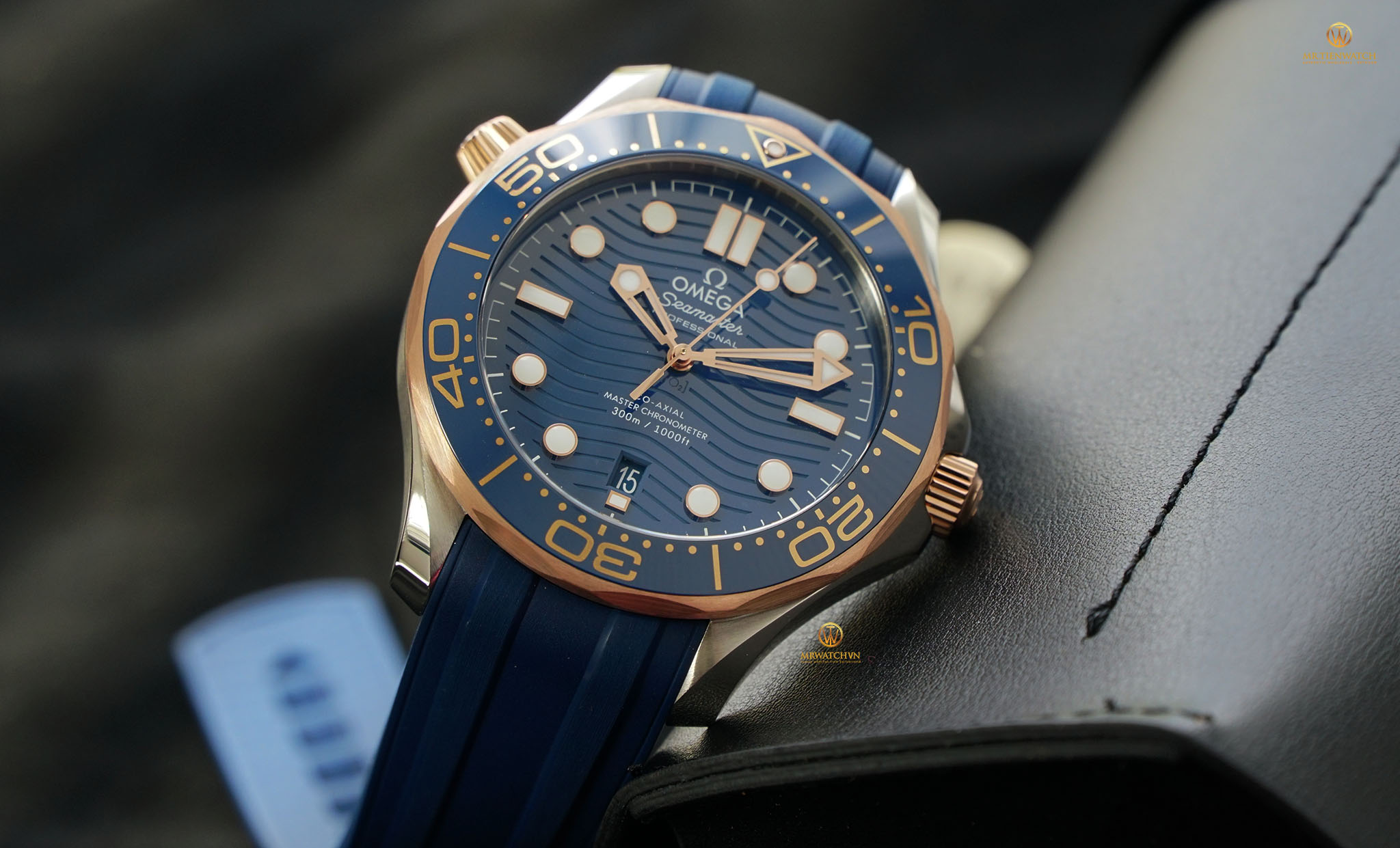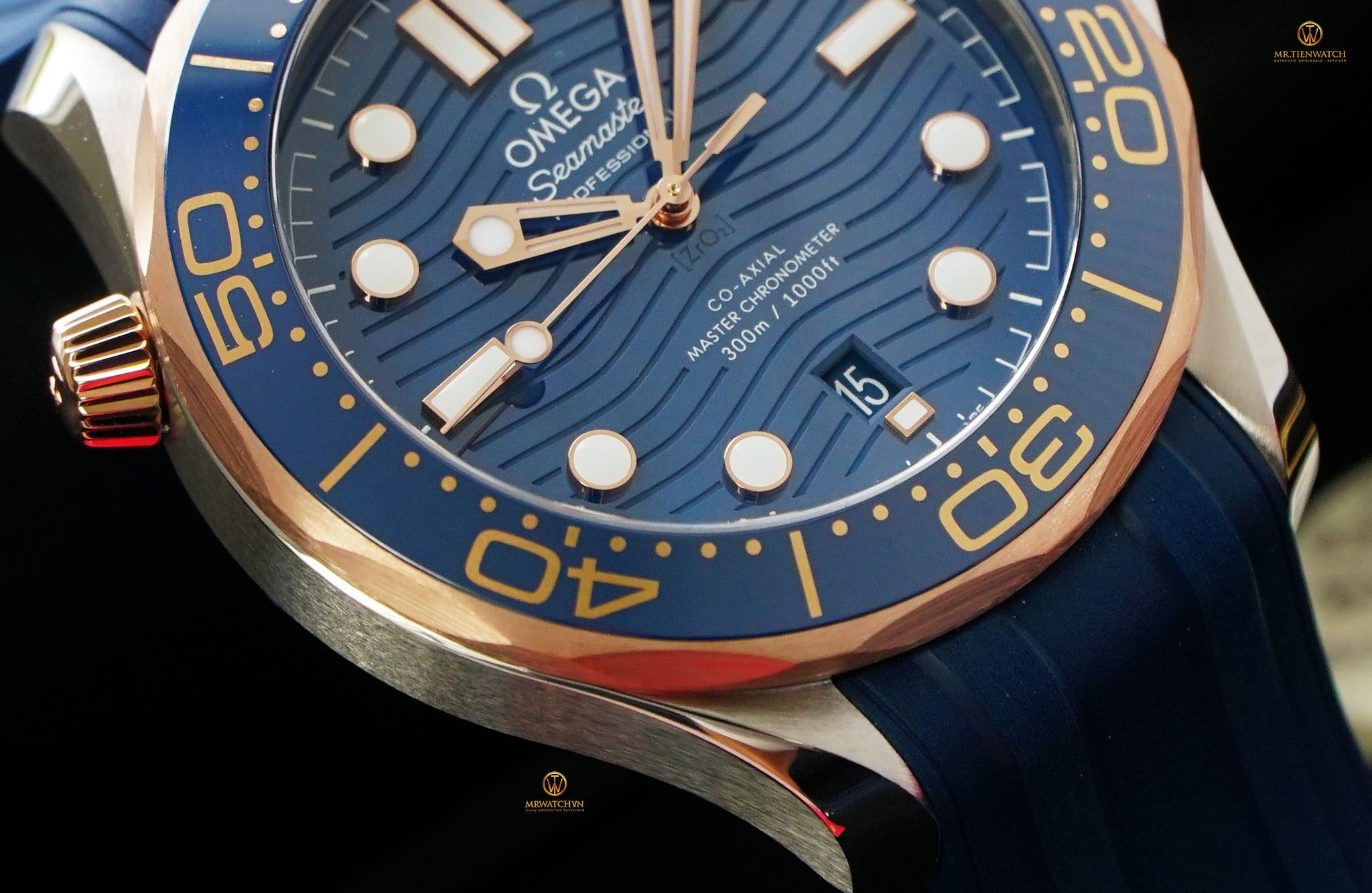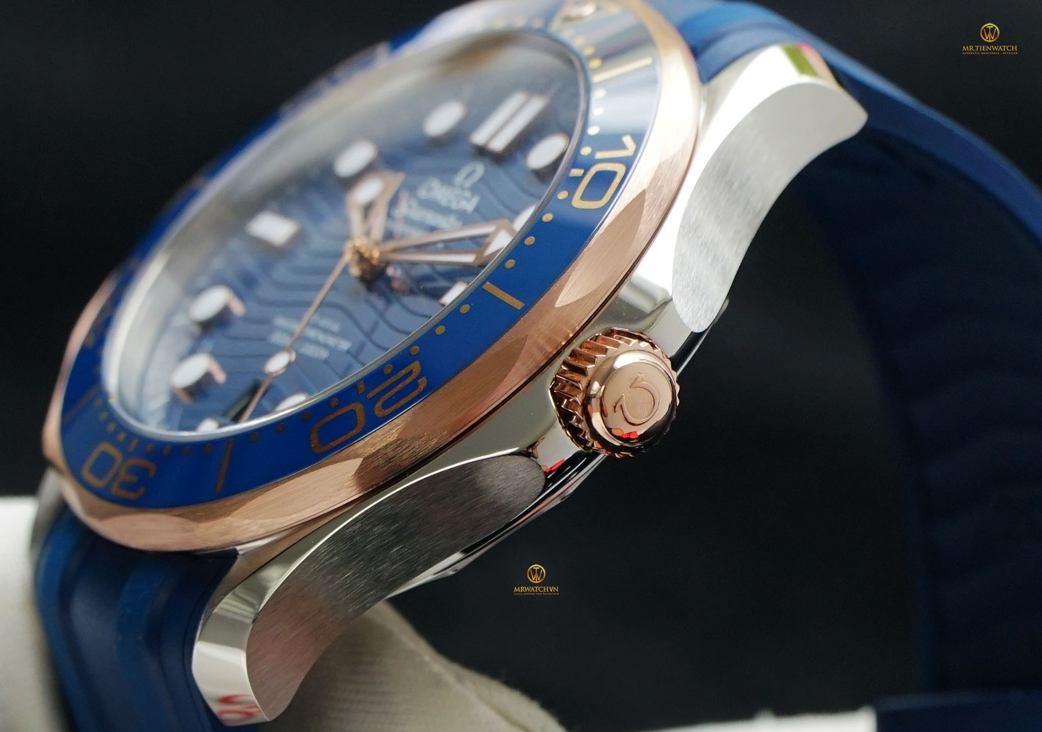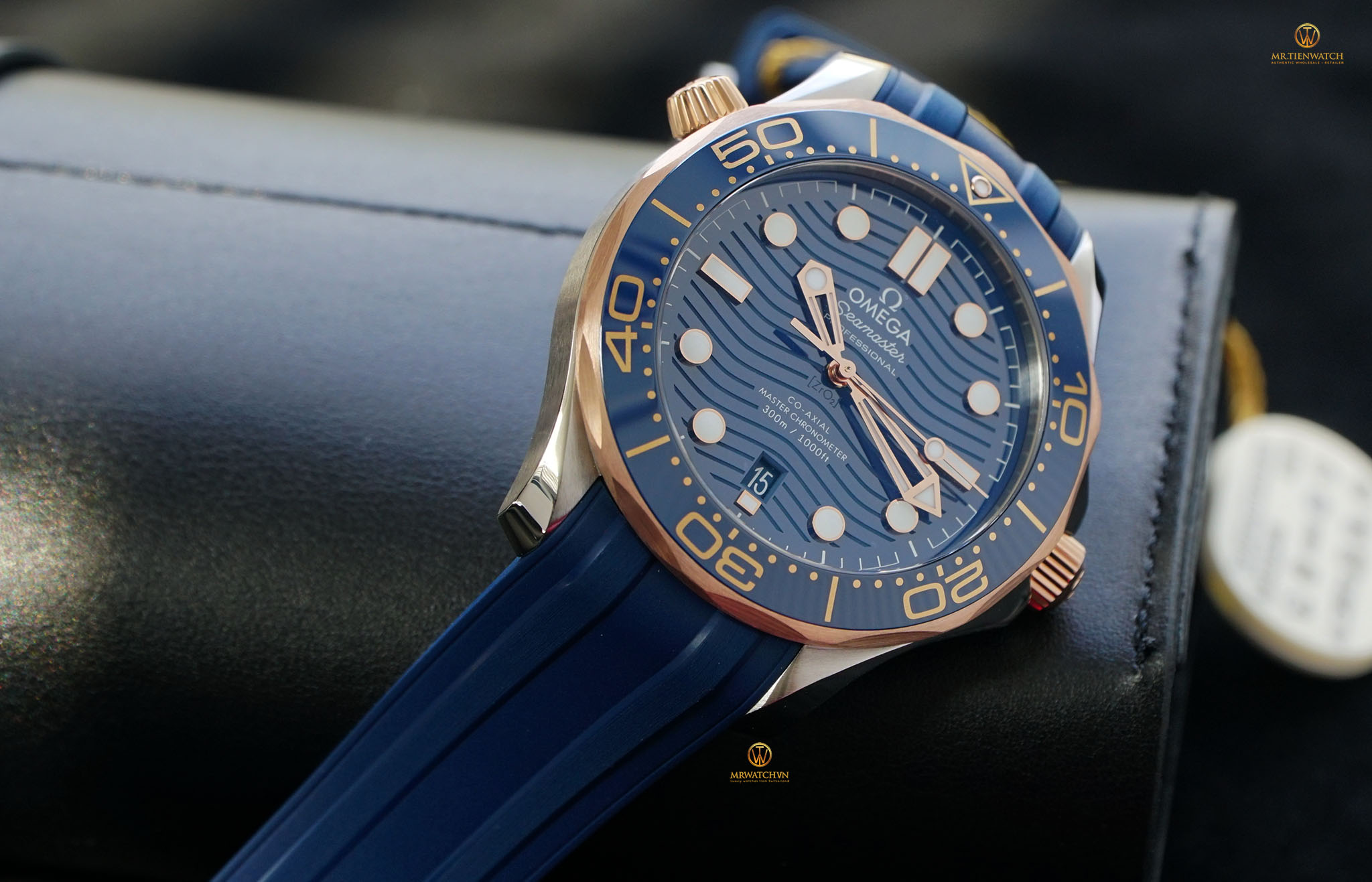 OMEGA SEAMASTER DIVER 300M CO‑AXIAL MASTER CHRONOMETER 42 MM 210.22.42.20.03.002 (21022422003002) Vàng 18k Sedna™, Thép không gỉ được chế tác từ thép không gỉ kết hợp với vàng hồng 18K (Sedna Gold) độc quyền của Omega, có khung viền bằng gốm xanh và thang chia thời gian lặn tráng men Ceragold. Mặt số màu xanh cũng được làm bằng gốm, được khắc laser sóng, có cửa sổ ngày ở vị trí 6 giờ. Các kim và vạch chỉ giờ được đúc bằng vàng hồng 18K phủ Super-LumiNova (siêu dạ quang) màu trắng. Van thoát khí heli thiết kế hình nón, dây đeo cao su màu xanh và bộ chuyển động OMEGA Master Chronometer Calibre 8800 có thể nhìn thấy qua mặt sau vỏ bằng tinh thể sapphire.