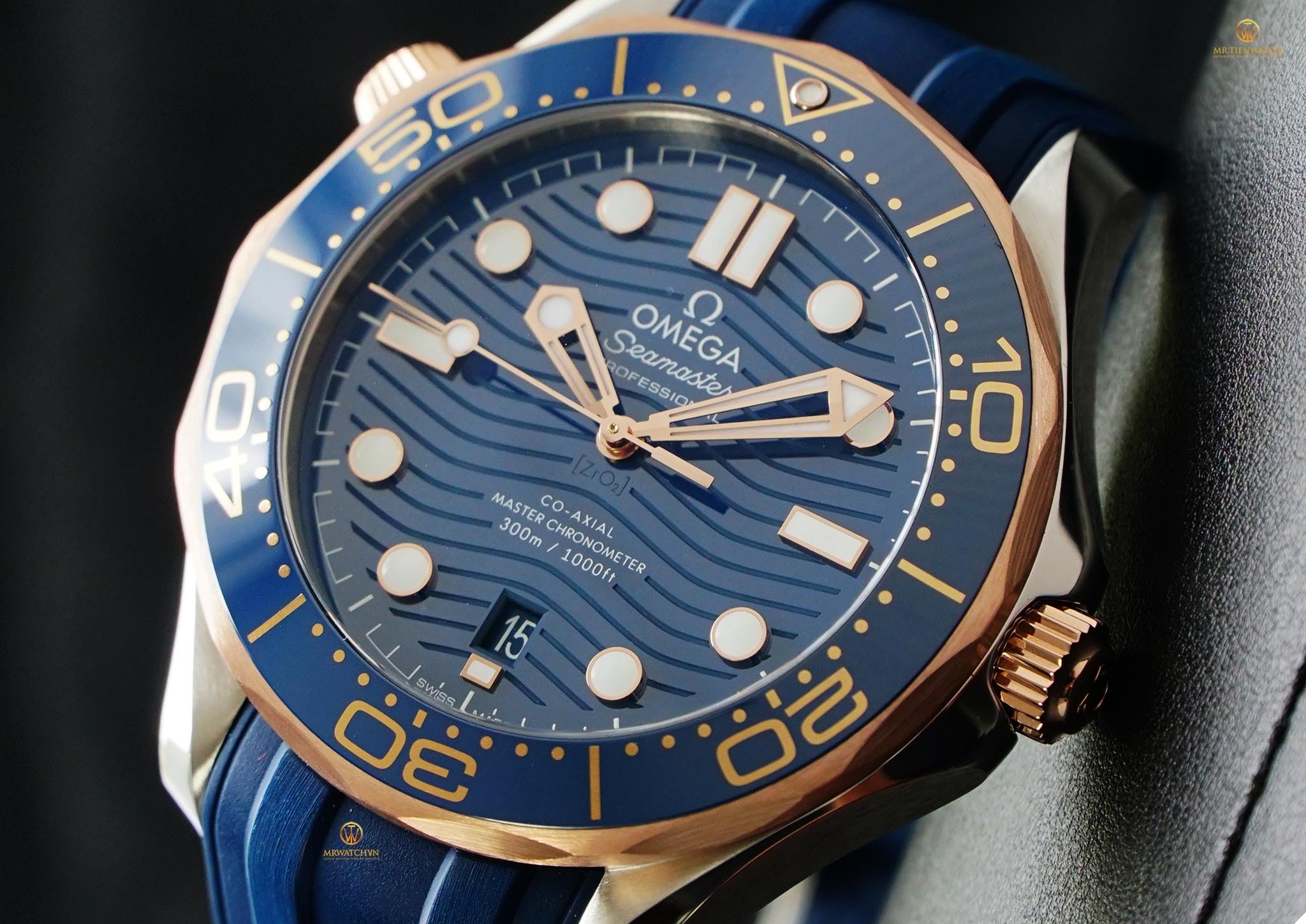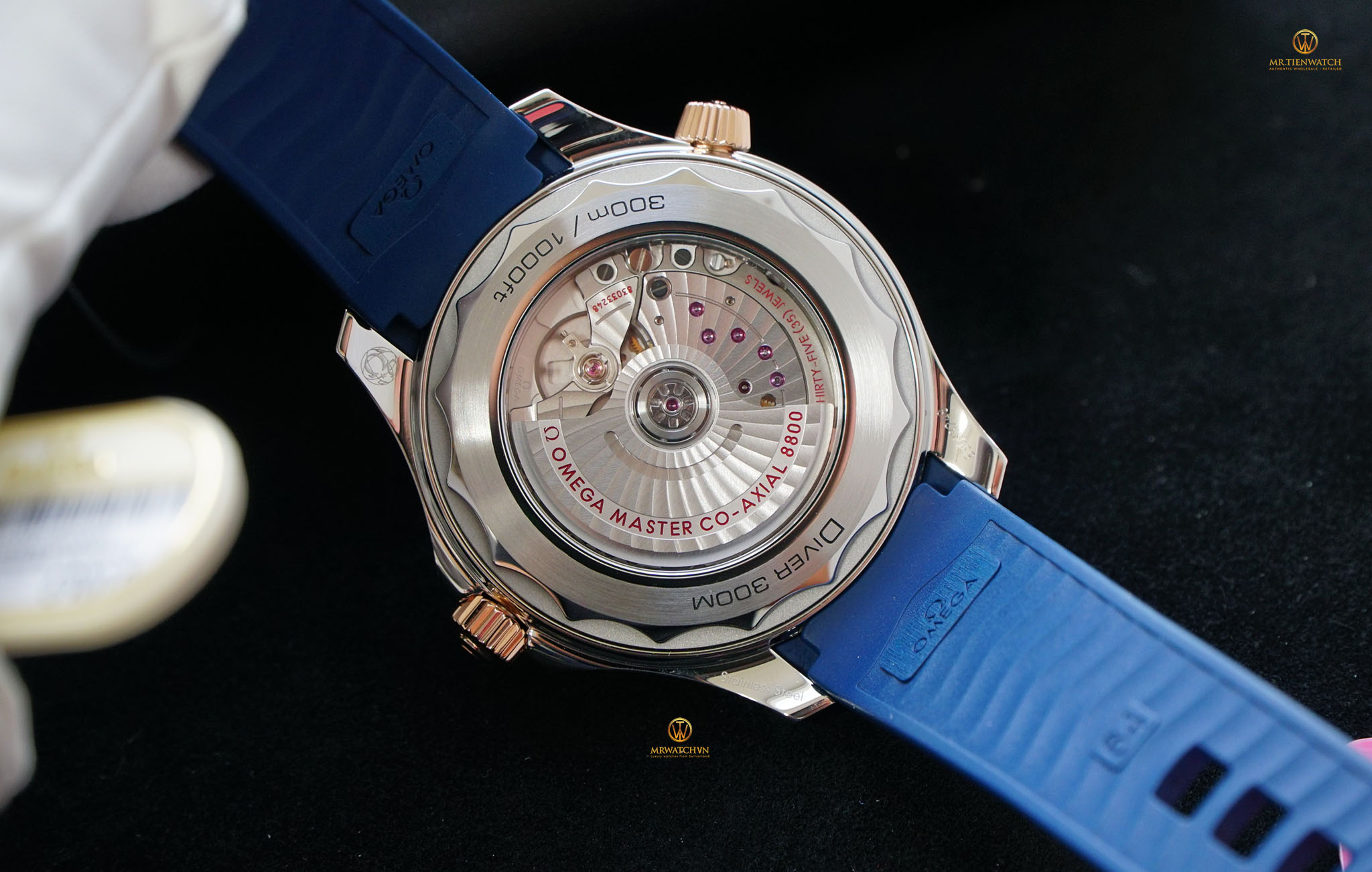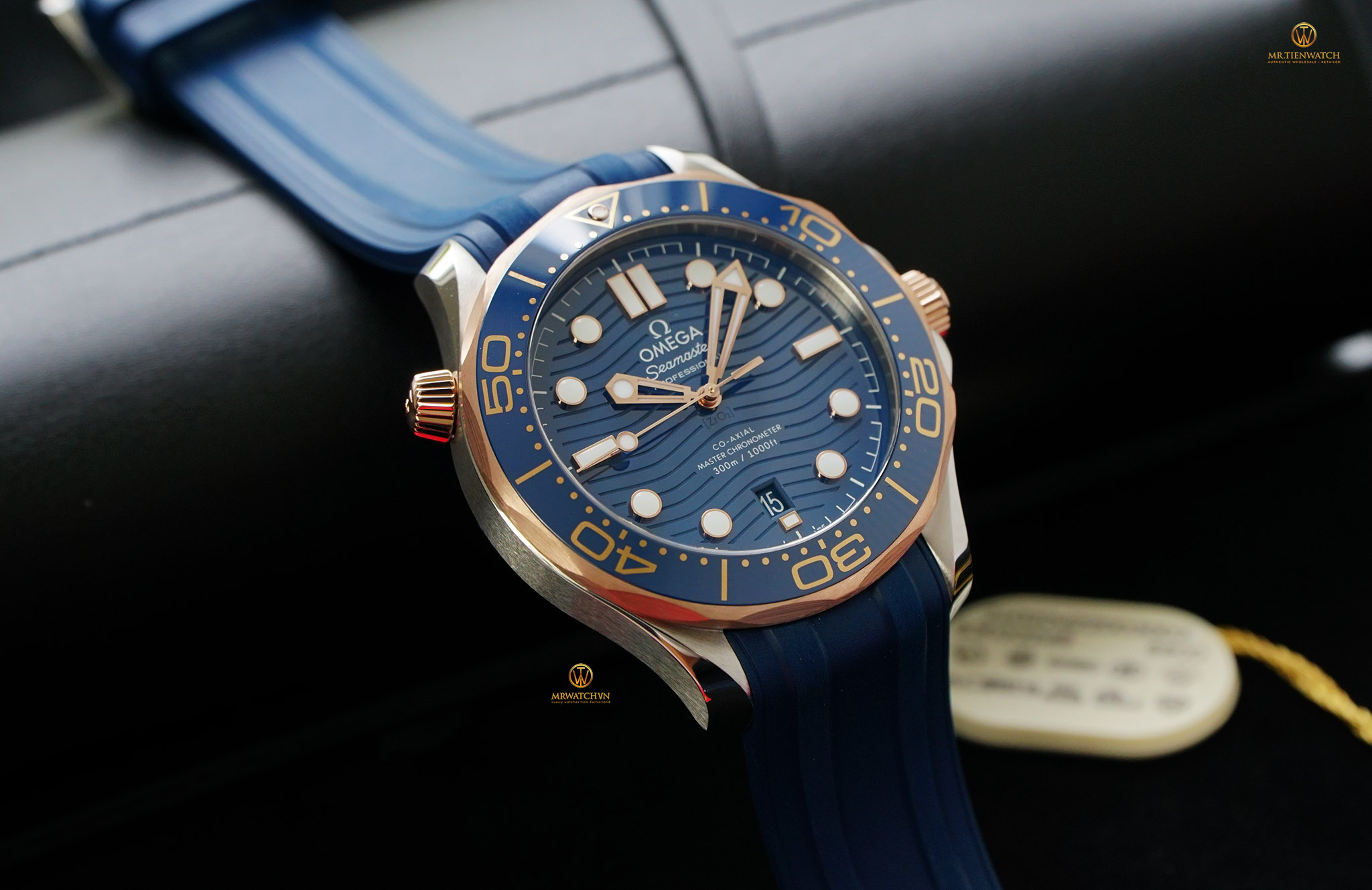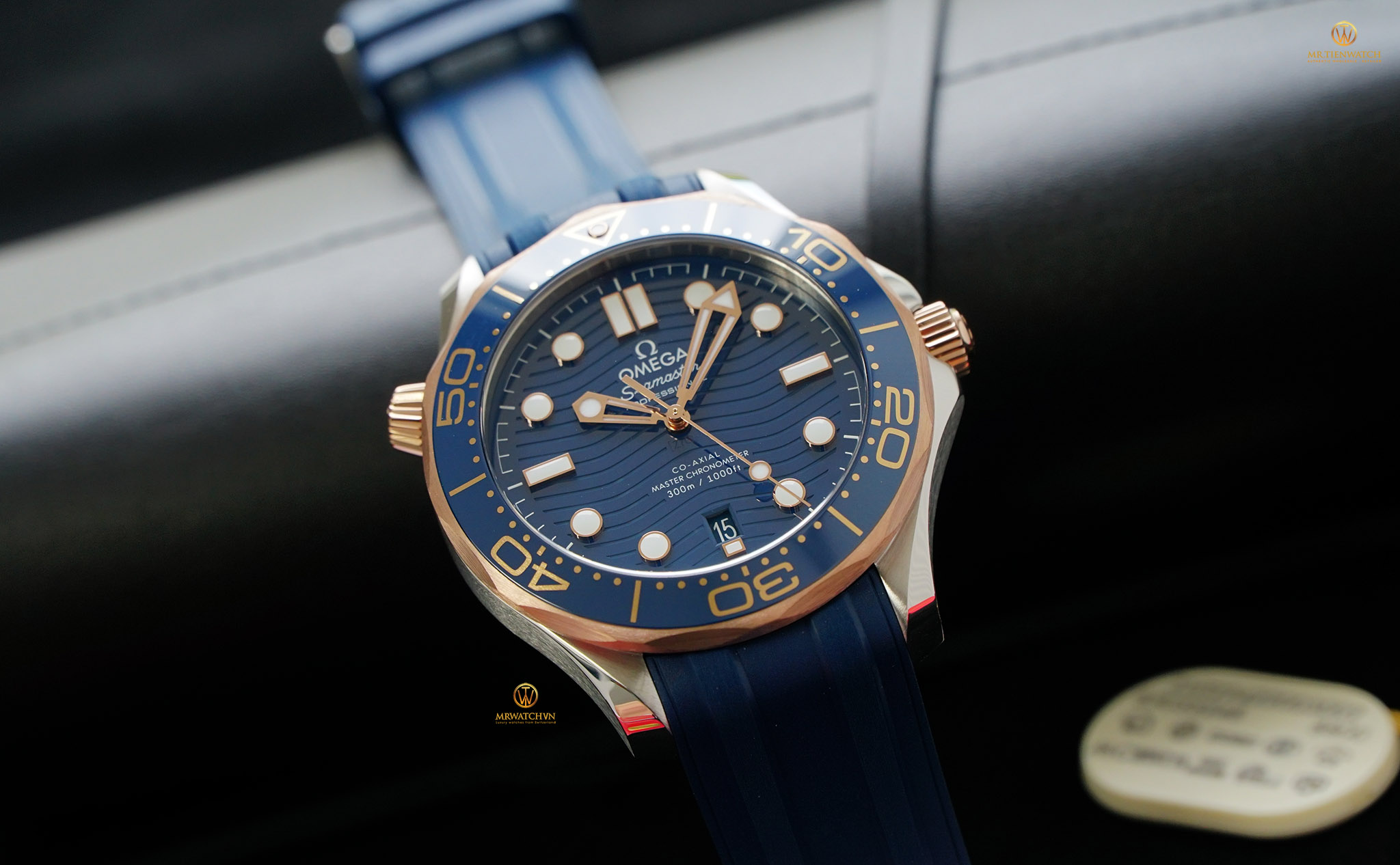OMEGA SEAMASTER DIVER 300M CO‑AXIAL MASTER CHRONOMETER 42 MM 210.22.42.20.03.002 (21022422003002) Vàng 18k Sedna™, Thép không gỉ được chế tác từ thép không gỉ kết hợp với vàng hồng 18K (Sedna Gold) độc quyền của Omega, có khung viền bằng gốm xanh và thang chia thời gian lặn tráng men Ceragold. Mặt số màu xanh cũng được làm bằng gốm, được khắc laser sóng, có cửa sổ ngày ở vị trí 6 giờ. Các kim và vạch chỉ giờ được đúc bằng vàng hồng 18K phủ Super-LumiNova (siêu dạ quang) màu trắng. Van thoát khí heli thiết kế hình nón, dây đeo cao su màu xanh và bộ chuyển động OMEGA Master Chronometer Calibre 8800 có thể nhìn thấy qua mặt sau vỏ bằng tinh thể sapphire.