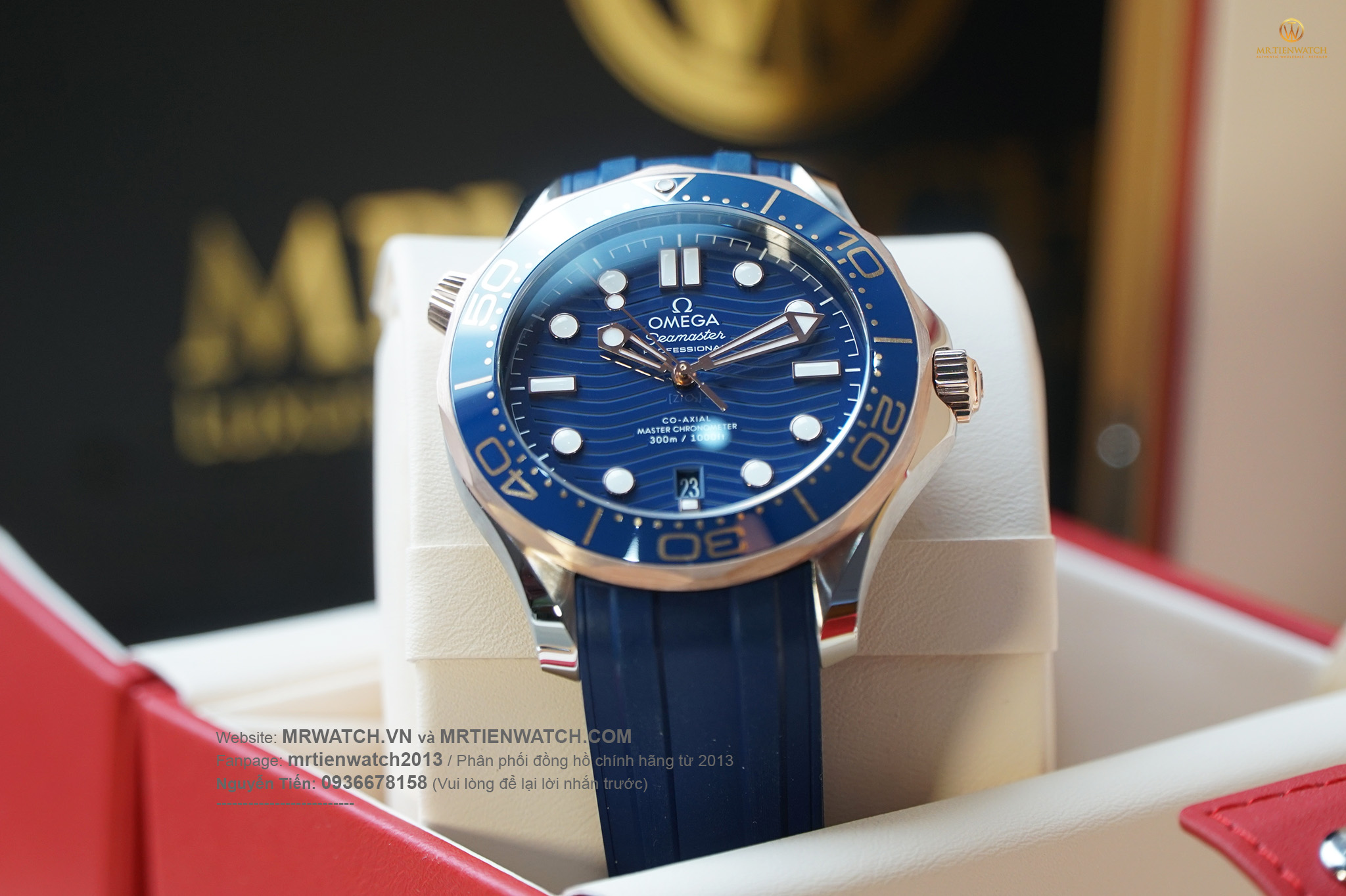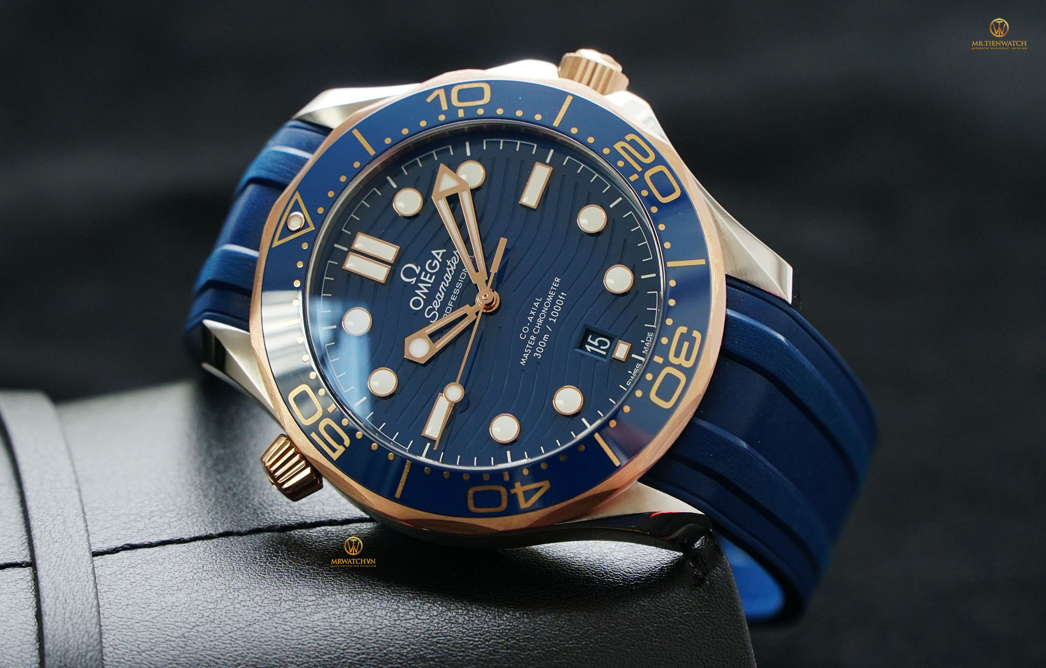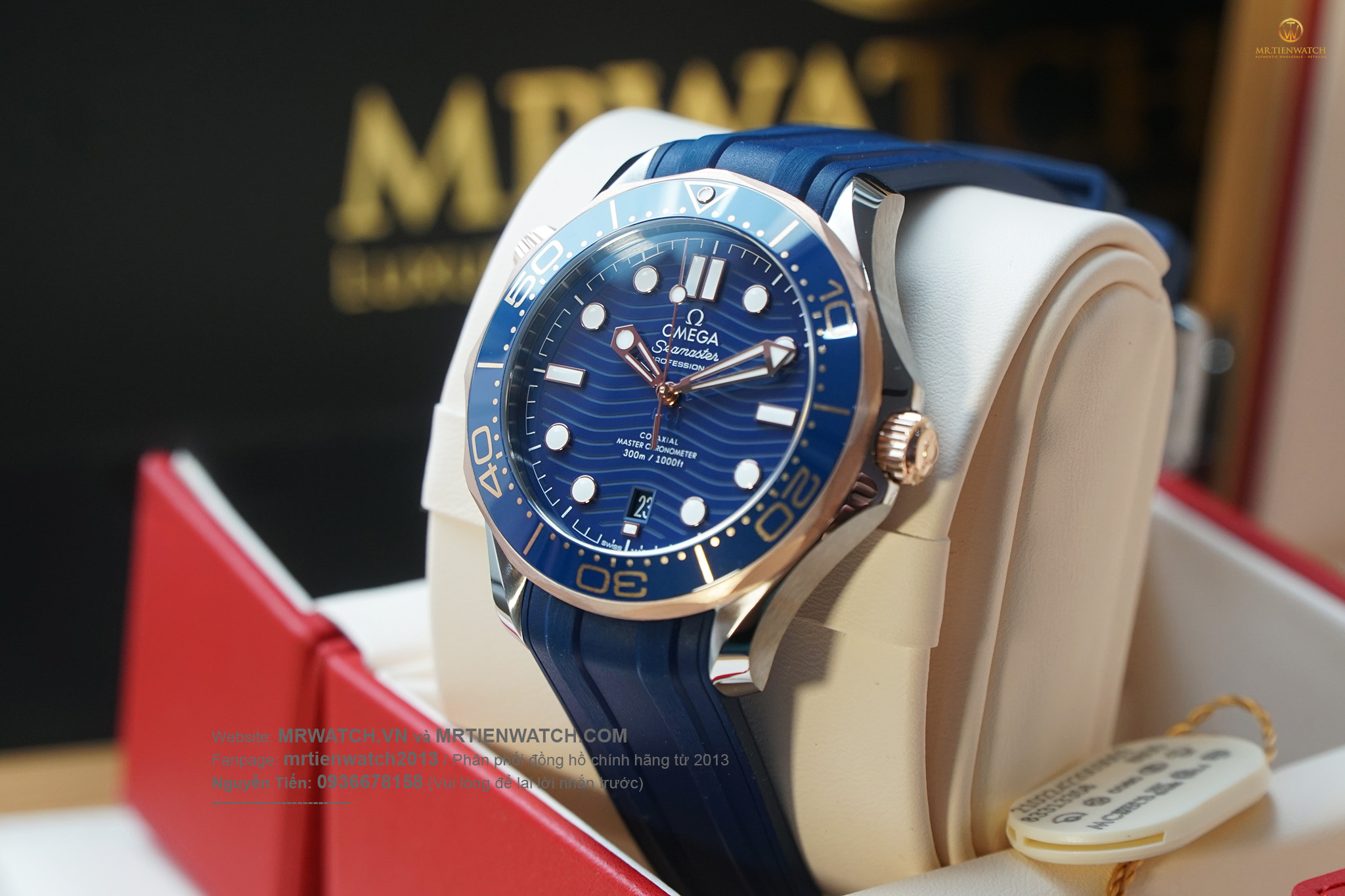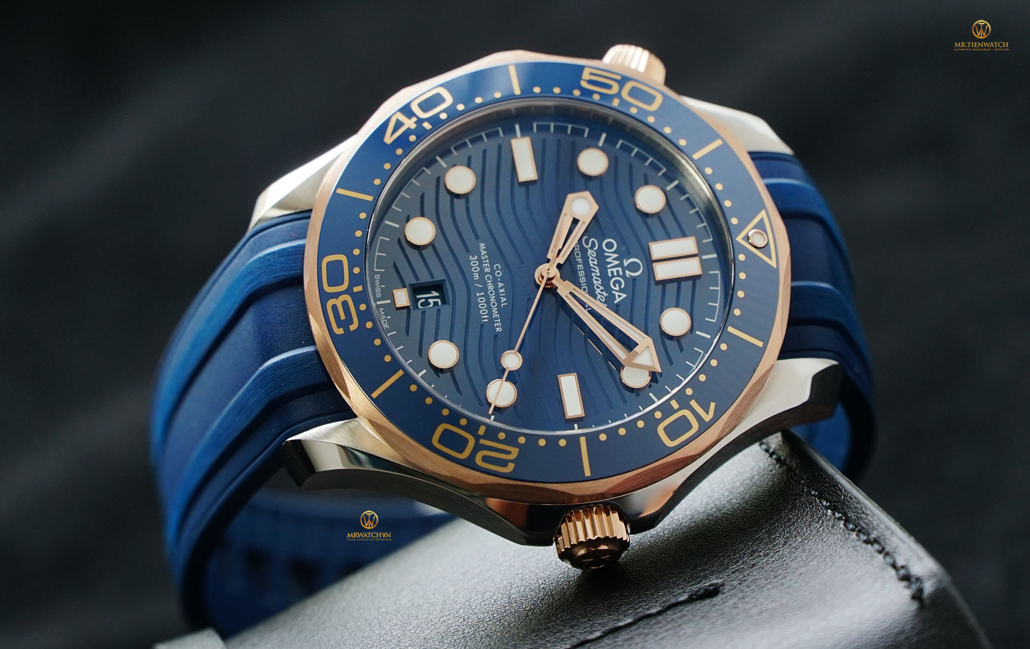 OMEGA SEAMASTER DIVER 300M CO‑AXIAL MASTER CHRONOMETER 42 MM 210.22.42.20.03.002 (21022422003002) Vàng 18k Sedna™, Thép không gỉ được chế tác từ thép không gỉ kết hợp với vàng hồng 18K (Sedna Gold) độc quyền của Omega, có khung viền bằng gốm xanh và thang chia thời gian lặn tráng men Ceragold. Mặt số màu xanh cũng được làm bằng gốm, được khắc laser sóng, có cửa sổ ngày ở vị trí 6 giờ. Các kim và vạch chỉ giờ được đúc bằng vàng hồng 18K phủ Super-LumiNova (siêu dạ quang) màu trắng. Van thoát khí heli thiết kế hình nón, dây đeo cao su màu xanh và bộ chuyển động OMEGA Master Chronometer Calibre 8800 có thể nhìn thấy qua mặt sau vỏ bằng tinh thể sapphire.