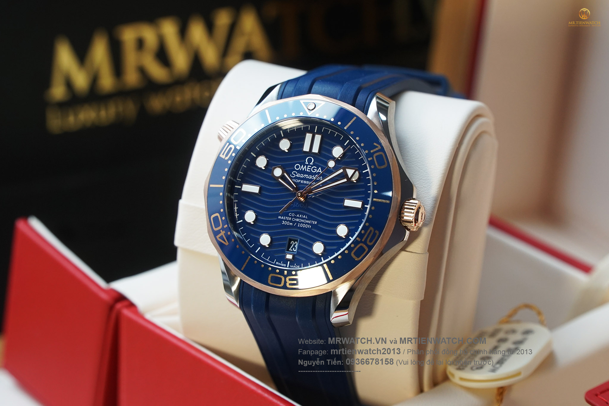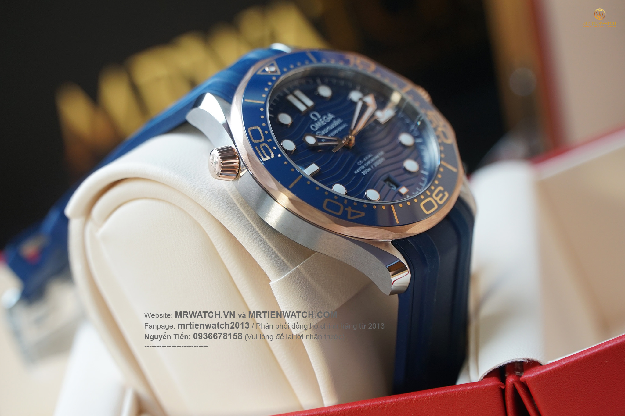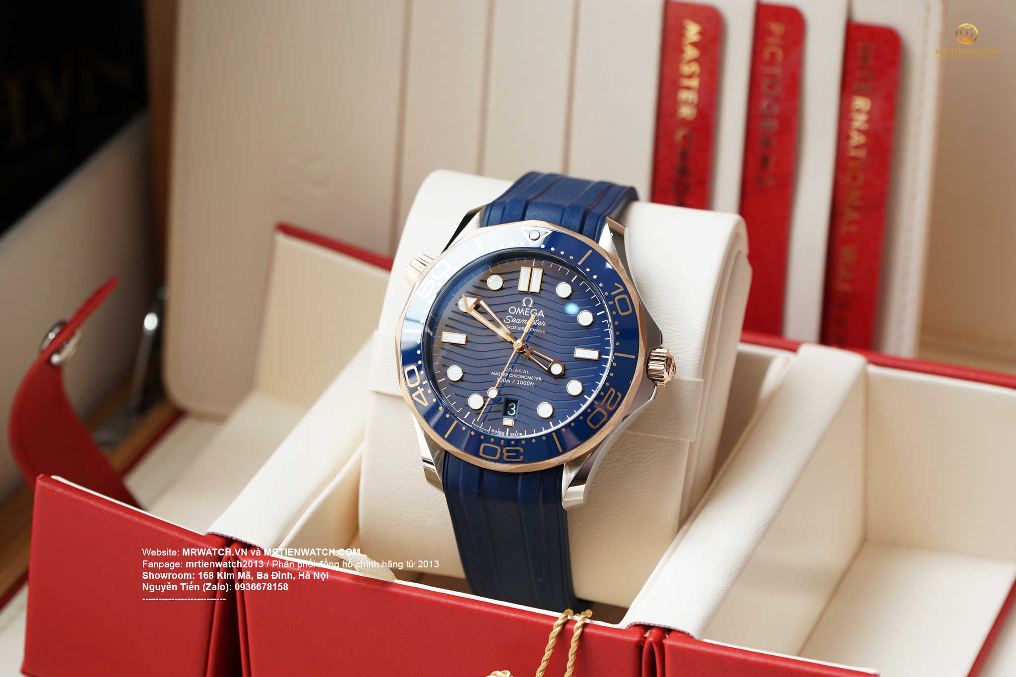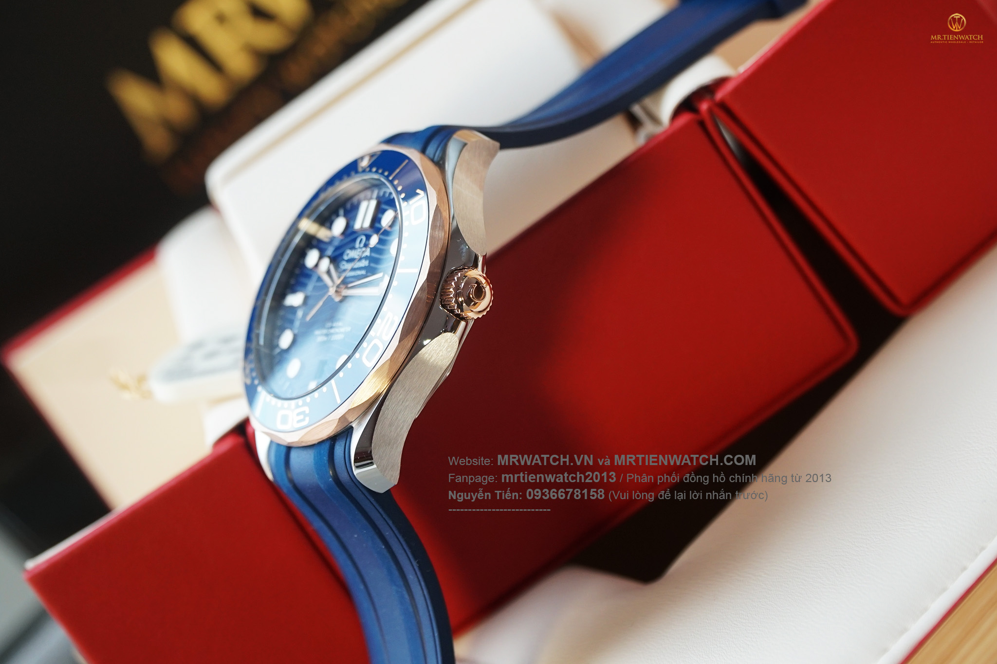 OMEGA SEAMASTER DIVER 300M CO‑AXIAL MASTER CHRONOMETER 42 MM 210.22.42.20.03.002 (21022422003002) Vàng 18k Sedna™, Thép không gỉ được chế tác từ thép không gỉ kết hợp với vàng hồng 18K (Sedna Gold) độc quyền của Omega, có khung viền bằng gốm xanh và thang chia thời gian lặn tráng men Ceragold. Mặt số màu xanh cũng được làm bằng gốm, được khắc laser sóng, có cửa sổ ngày ở vị trí 6 giờ. Các kim và vạch chỉ giờ được đúc bằng vàng hồng 18K phủ Super-LumiNova (siêu dạ quang) màu trắng. Van thoát khí heli thiết kế hình nón, dây đeo cao su màu xanh và bộ chuyển động OMEGA Master Chronometer Calibre 8800 có thể nhìn thấy qua mặt sau vỏ bằng tinh thể sapphire.