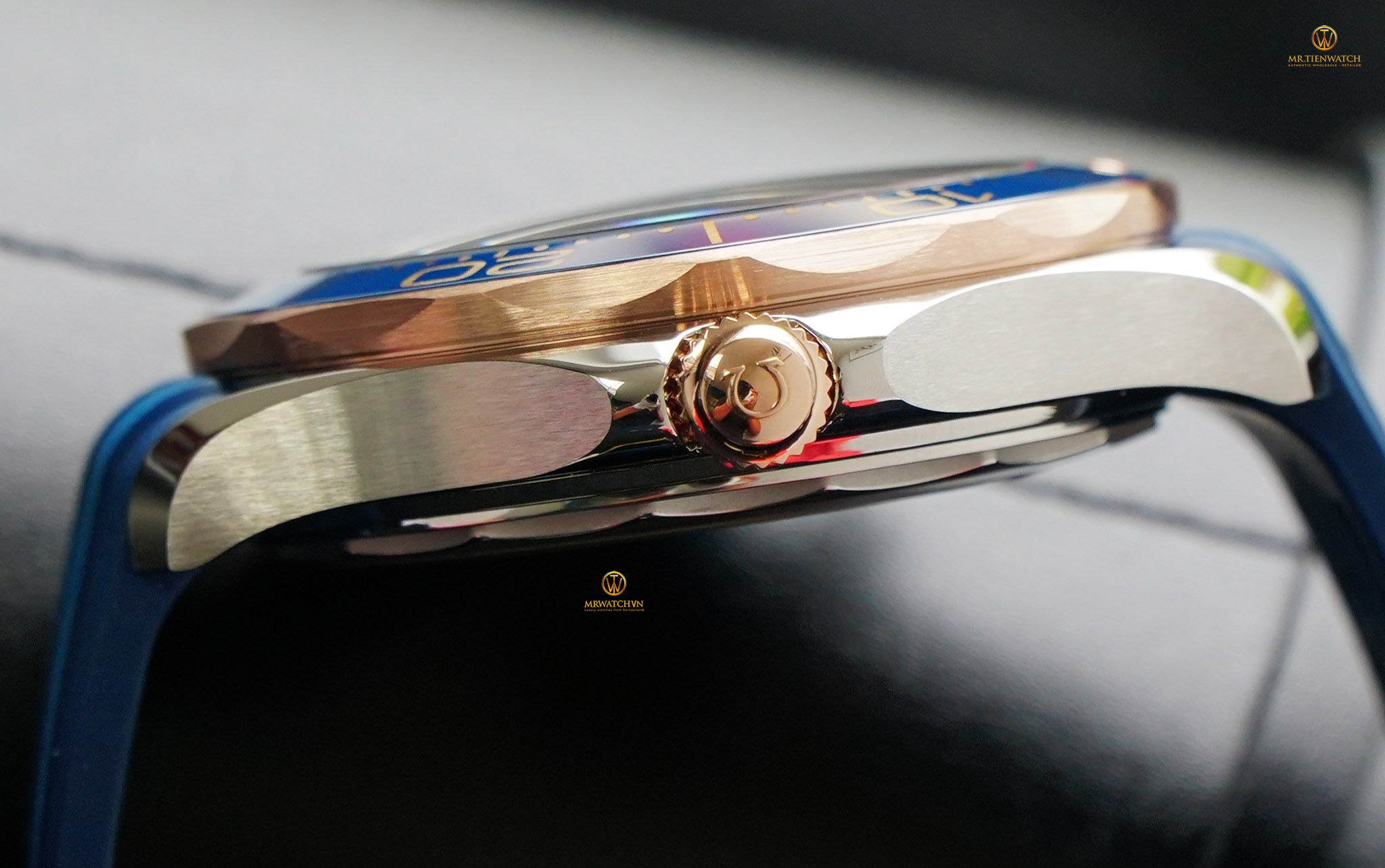 Một chút thay đổi nhỏ ở phần niềng, núm chỉnh giờ và van heli đã khiến thiết kế này trong " sang" hơn rất nhiều, lộng lẫy dưới ánh sáng và thu hút mọi ánh nhìn. Cũng có nhiều ý kiến cho rằng " vàng" làm yếu đi phong cách thể thao đặc trưng của SeaMaster 300 nhưng bản thân tôi lại khá thích thú với vàng, rõ ràng lên tay sẽ sang trọng và đẳng cấp hơn nhiều, đặc biệt khi xu hướng đồng hồ công sở đang thịnh hành như hiện nay.