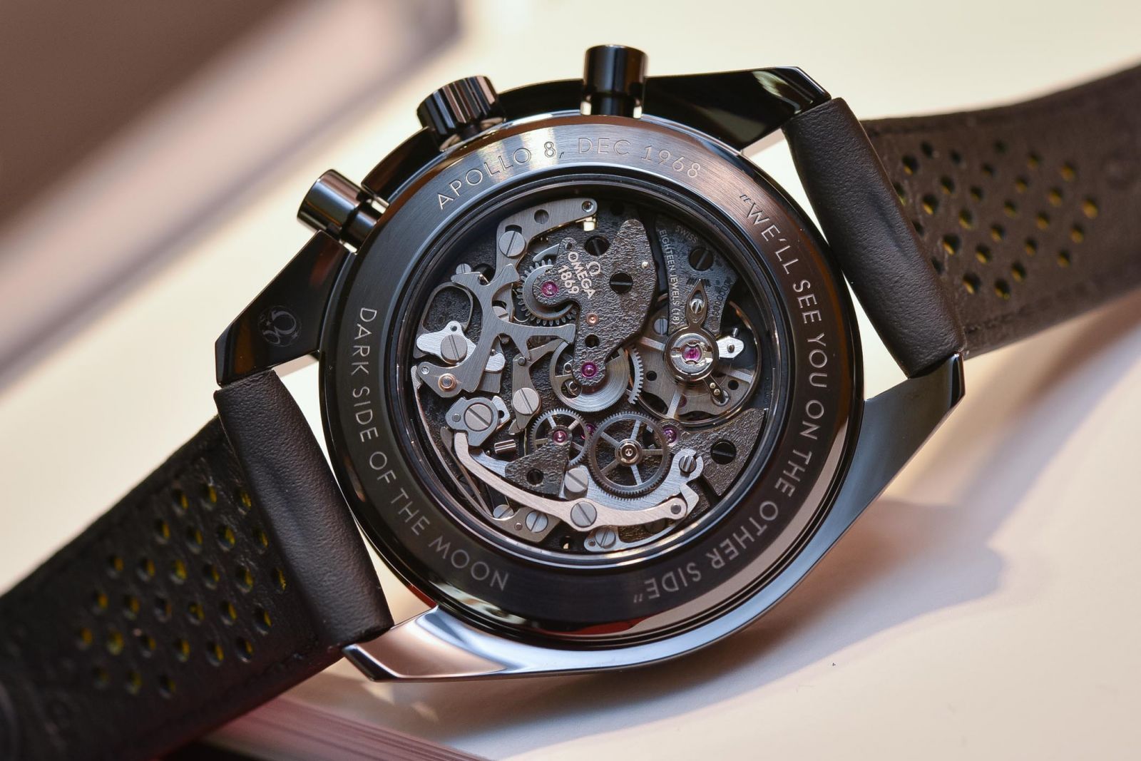 Điều làm cho chiếc Apollo 8 Speedmaster Dark Side of the Moon hấp dẫn như vậy là bề mặt mặt trăng lốm đốm các đốm đen được tái tạo trên bộ máy. Để thể hiện sự tôn kính đến cả hai bề mặt của Mặt Trăng, mặt số có màu sáng hơn để phản ánh được góc nhìn của chúng ta – những người mặt đất, trong khi mặt sau của đồng hồ lại tối hơn để tái tạo lại bề mặt tối của Mặt Trăng mà những phi hành gia nhìn thấy. Để đạt được bề mặt sát với thực tế như vậy, cơ chế cắt laser được sử dụng để trang trí các cây cầu và tấm chính trên bộ máy đen.