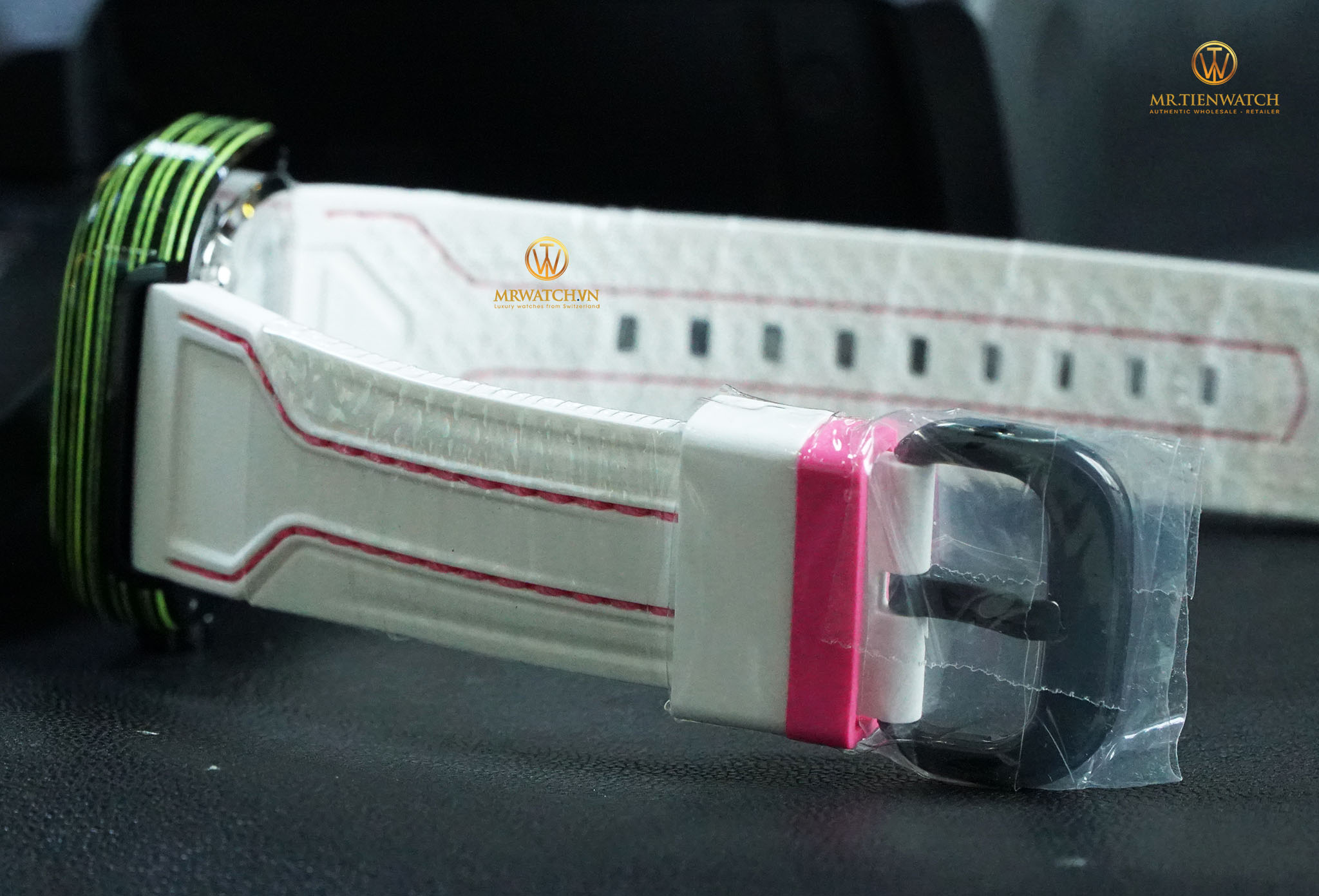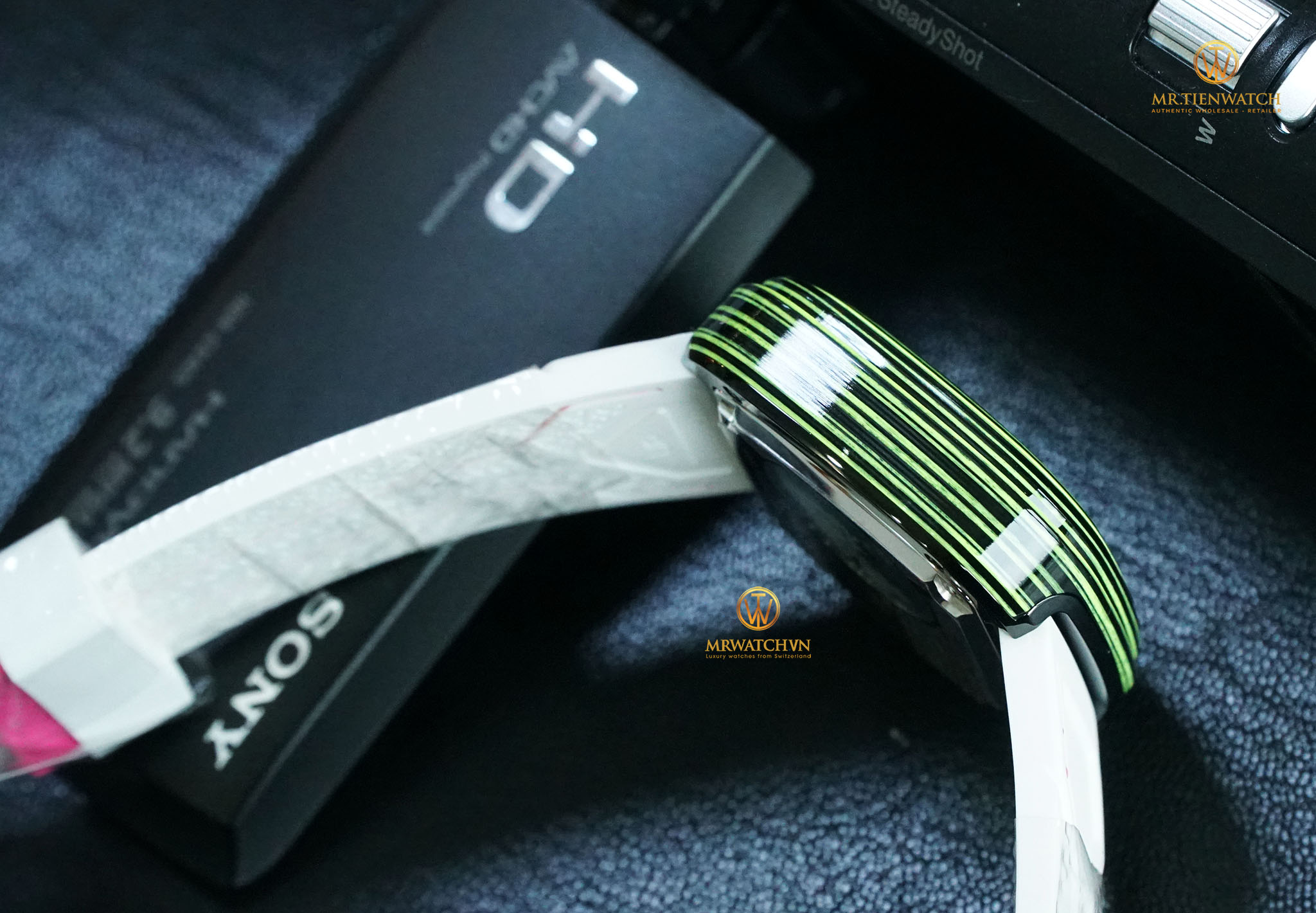 Sevenfriday M-Series M3/03 Psycho Limited Edition có thiết kế dây silicon trắng, mặt số xanh là độc đáo, trẻ trung và thật sự cuốn hút. Cách phối color block đa màu rất táo bạo, nhất ở trên mặt đồng hồ; dây silicone ôm tay, tạo cảm giác thoải mái và trẻ trung cho người đeo; vòng animation làm từ kết hợp đa lớp carbon và resin, kèm một lớp resin bóng bẩy phủ bên ngoài. Nhưng đặc biệt hơn cả, toàn bộ đồng hồ được phủ lớp sơn dạ quang, biến chủ nhân thành tâm điểm trong mọi cuộc vui họ tham gia. Mỗi phiên bản này chỉ được sản xuất 150 chiếc trên toàn thế giới.